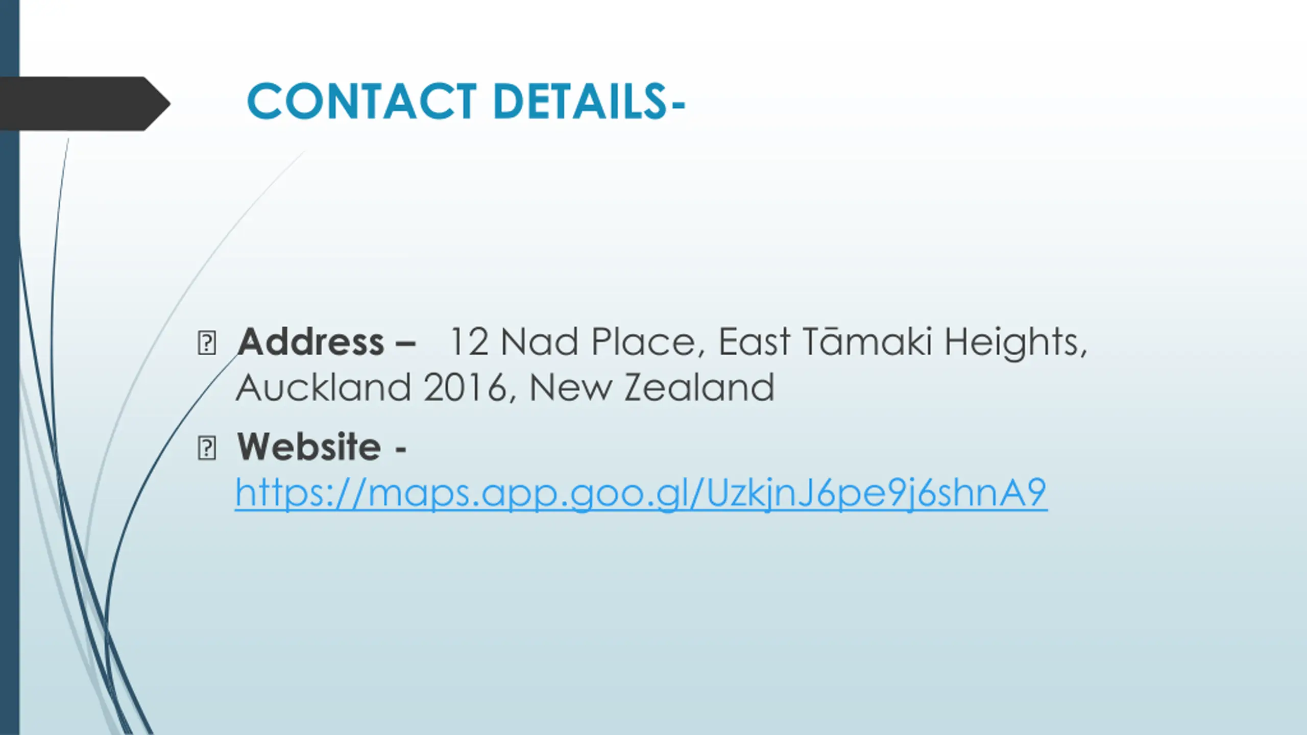 CONTACT DETAILS- ? Address 12 Nad Place, East T maki Heights, Auckland 2016, New Zealand ? Website - https://maps.app.goo.gl/UzkjnJ6pe9j6shnA9