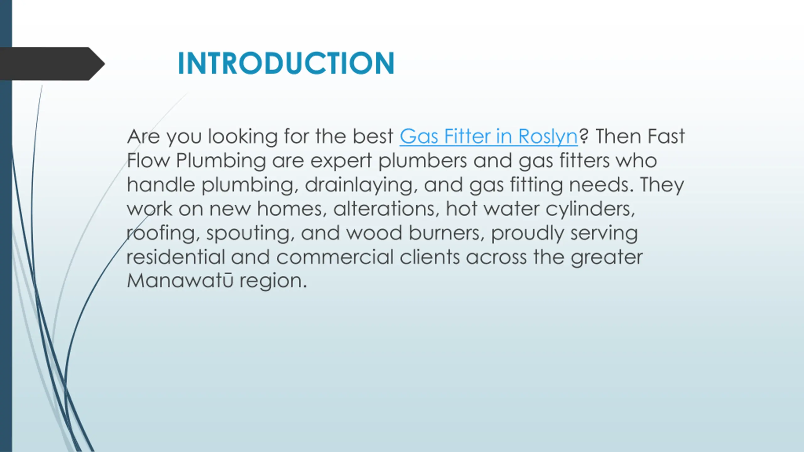 INTRODUCTION Are you looking for the best Gas Fitter in Roslyn? Then Fast Flow Plumbing are expert plumbers and gas fitters who handle plumbing, drainlaying, and gas fitting needs. They work on new homes, alterations, hot water cylinders, roofing, spouting, and wood burners, proudly serving residential and commercial clients across the greater Manawat region.