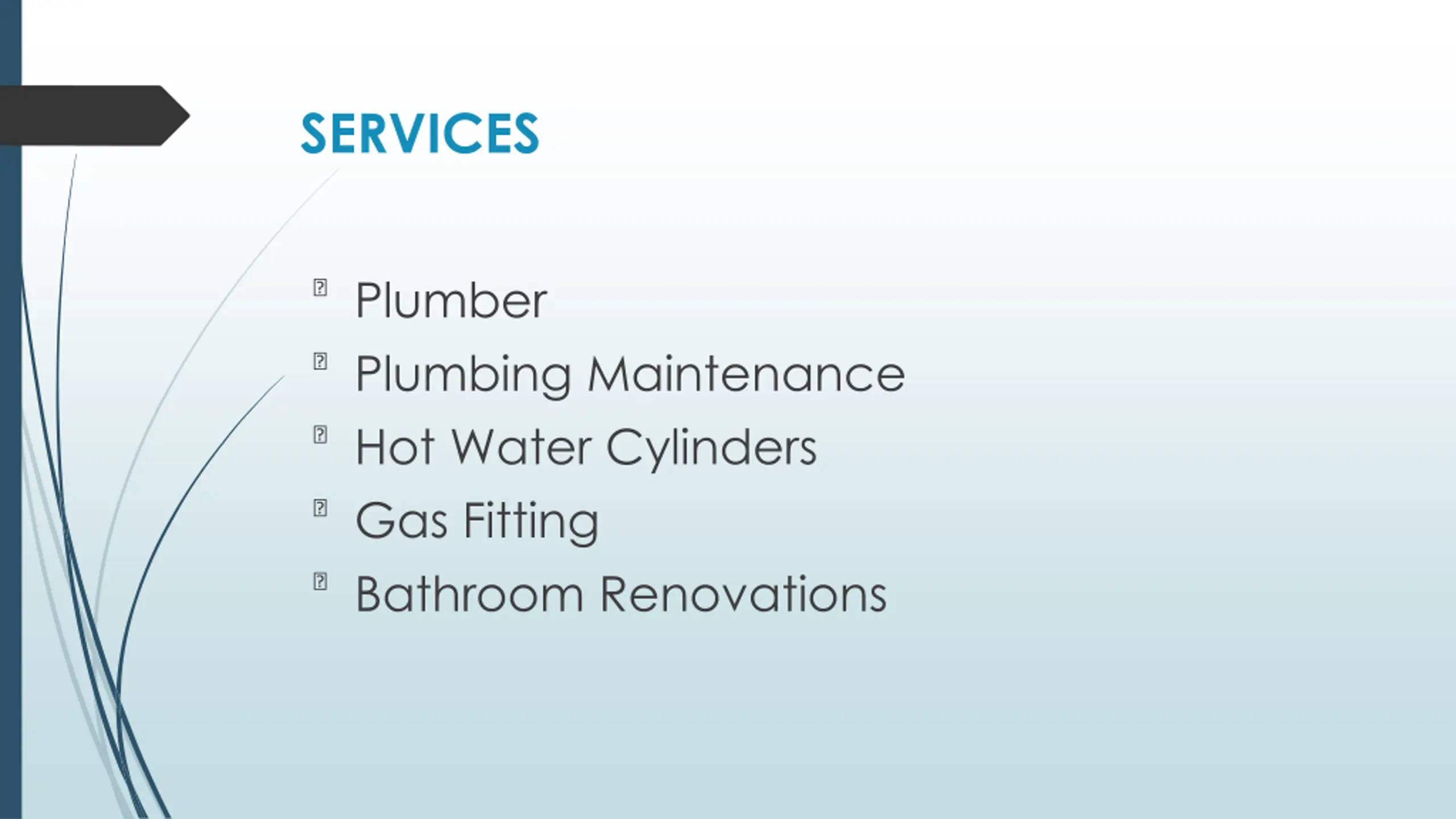 SERVICES ?Plumber ?Plumbing Maintenance ?Hot Water Cylinders ?Gas Fitting ?Bathroom Renovations