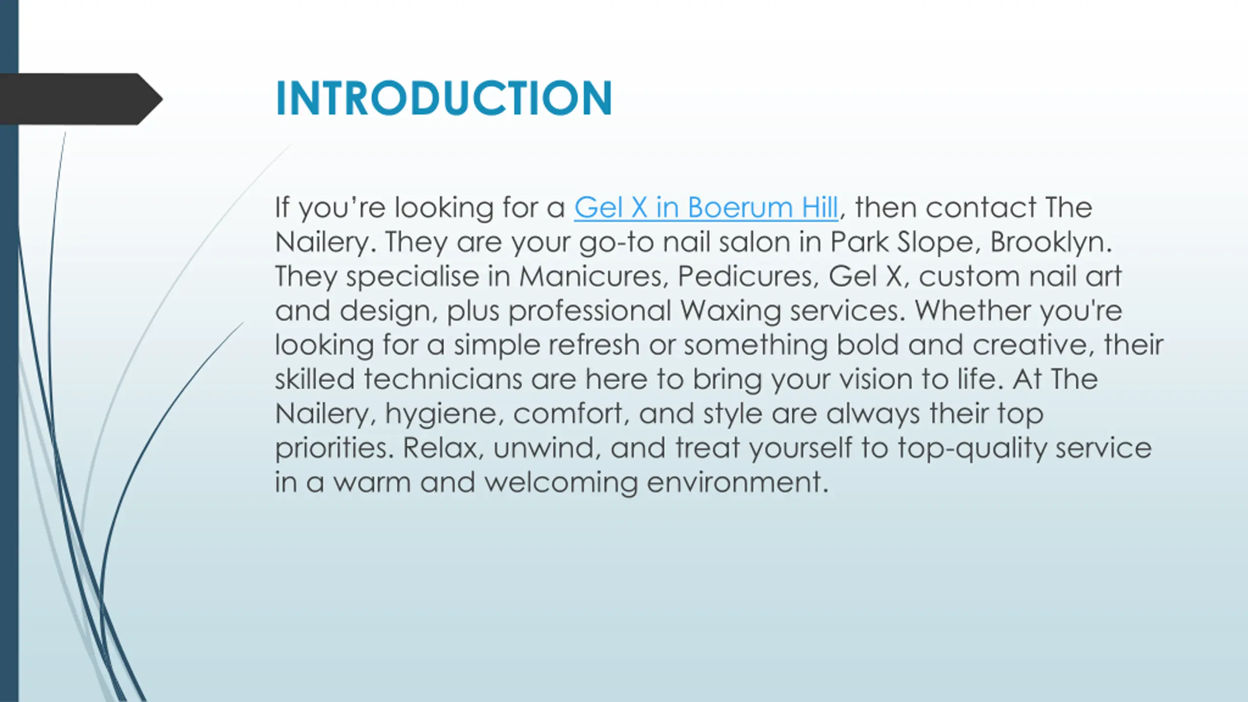 INTRODUCTION If you re looking for a Gel X in Boerum Hill, then contact The Nailery. They are your go-to nail salon in Park Slope, Brooklyn. They specialise in Manicures, Pedicures, Gel X, custom nail art and design, plus professional Waxing services. Whether you're looking for a simple refresh or something bold and creative, their skilled technicians are here to bring your vision to life. At The Nailery, hygiene, comfort, and style are always their top priorities. Relax, unwind, and treat yourself to top-quality service in a warm and welcoming environment.