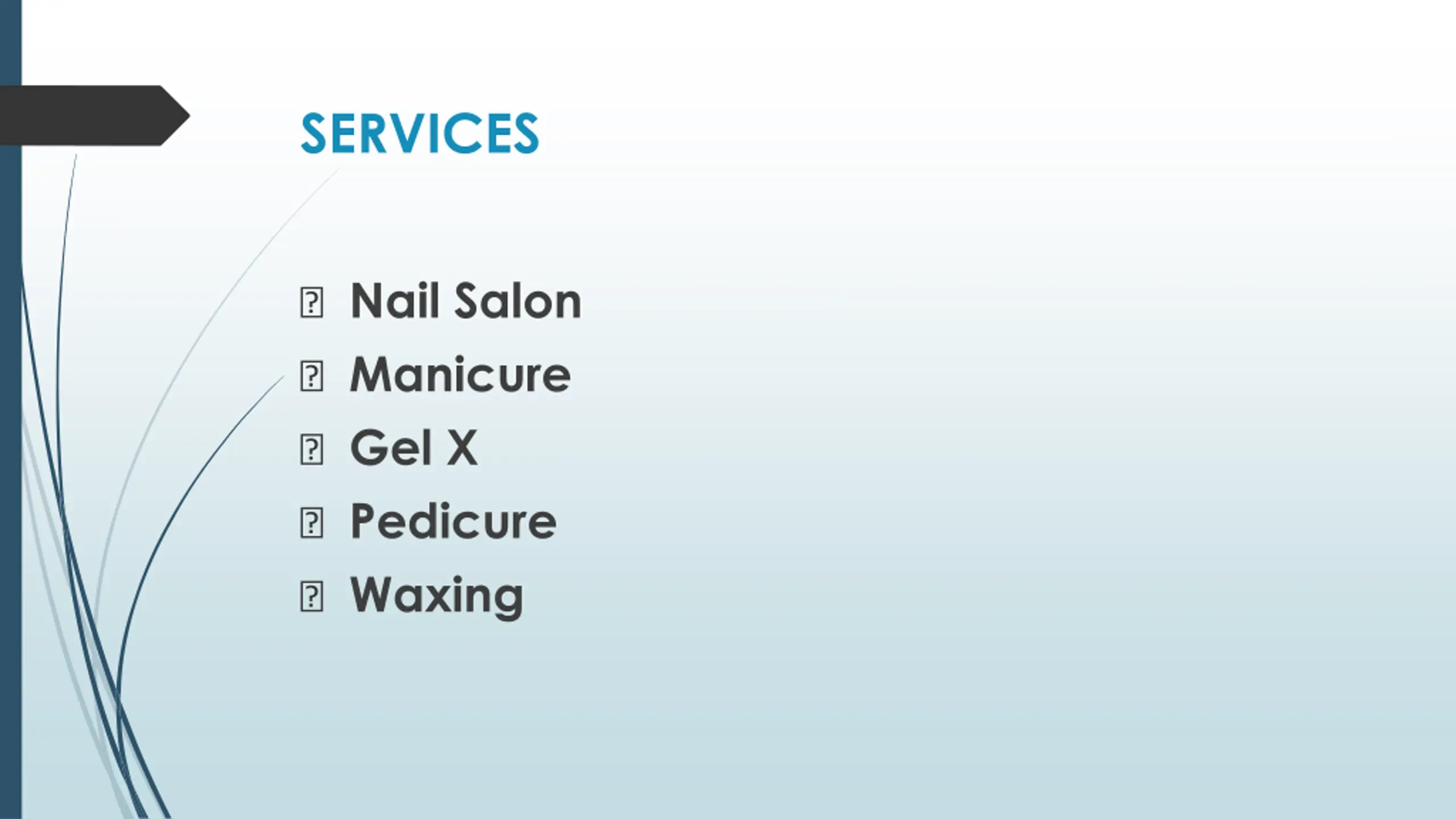 SERVICES ? Nail Salon ? Manicure ? Gel X ? Pedicure ? Waxing
