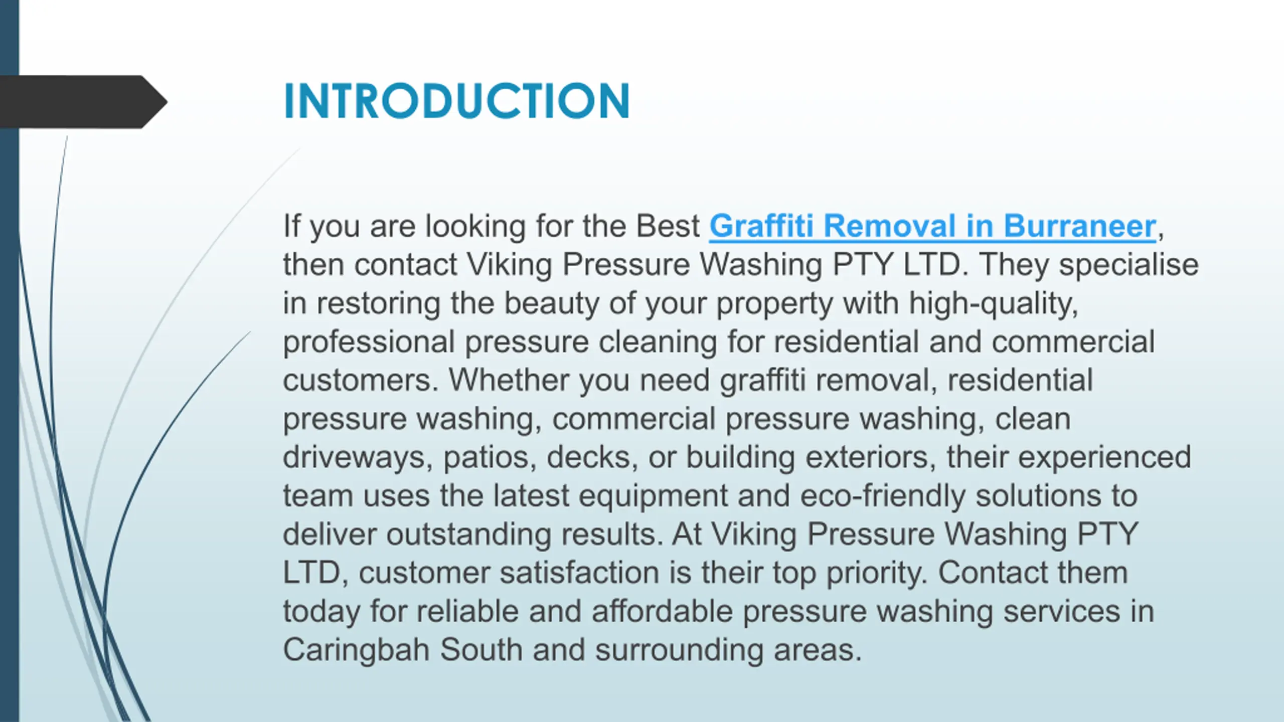 INTRODUCTION If you are looking for the Best Graffiti Removal in Burraneer, then contact Viking Pressure Washing PTY LTD. They specialise in restoring the beauty of your property with high-quality, professional pressure cleaning for residential and commercial customers. Whether you need graffiti removal, residential pressure washing, commercial pressure washing, clean driveways, patios, decks, or building exteriors, their experienced team uses the latest equipment and eco-friendly solutions to deliver outstanding results. At Viking Pressure Washing PTY LTD, customer satisfaction is their top priority. Contact them today for reliable and affordable pressure washing services in Caringbah South and surrounding areas.