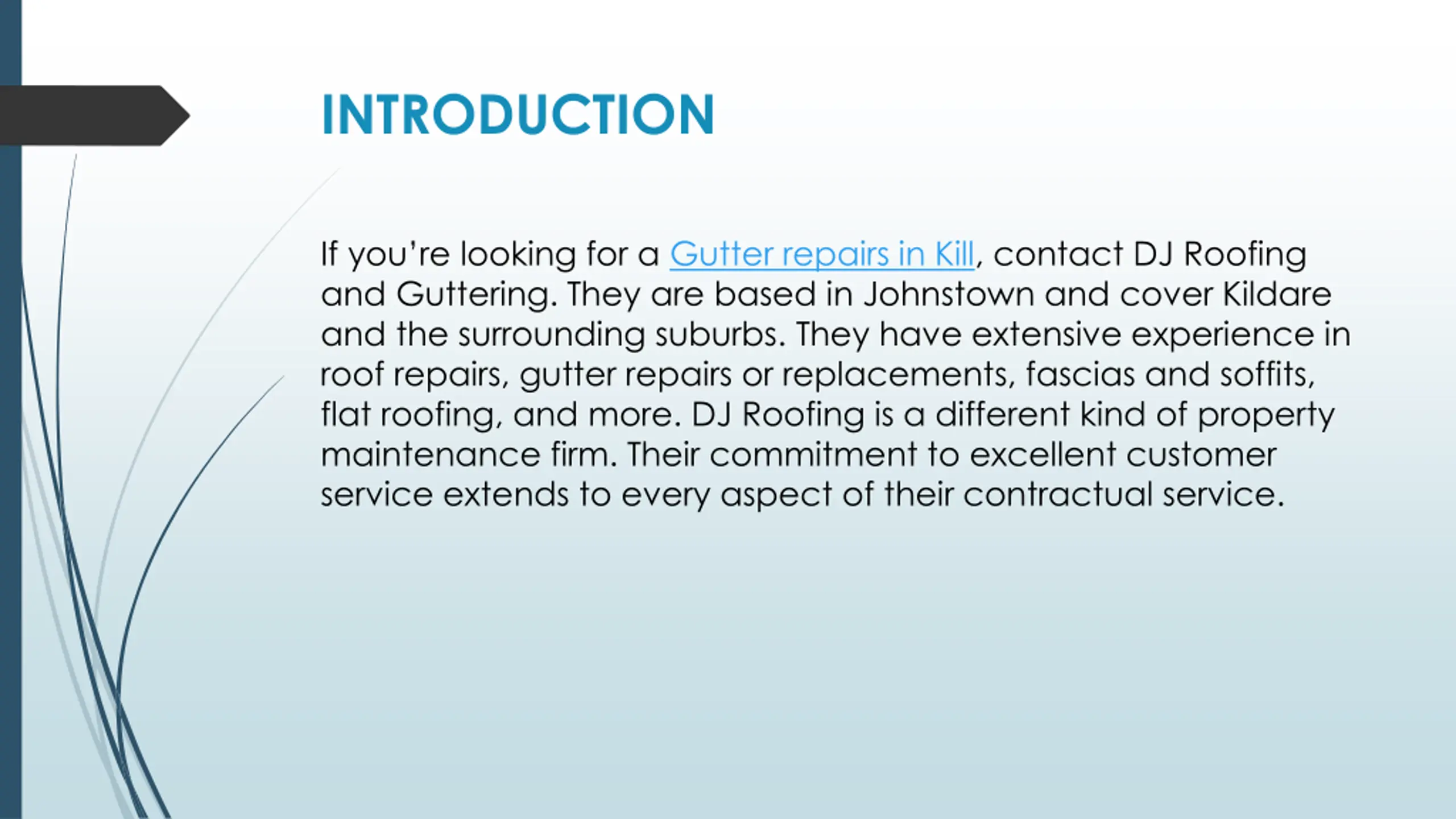 INTRODUCTION If you re looking for a Gutter repairs in Kill, contact DJ Roofing and Guttering. They are based in Johnstown and cover Kildare and the surrounding suburbs. They have extensive experience in roof repairs, gutter repairs or replacements, fascias and soffits, flat roofing, and more. DJ Roofing is a different kind of property maintenance firm. Their commitment to excellent customer service extends to every aspect of their contractual service.