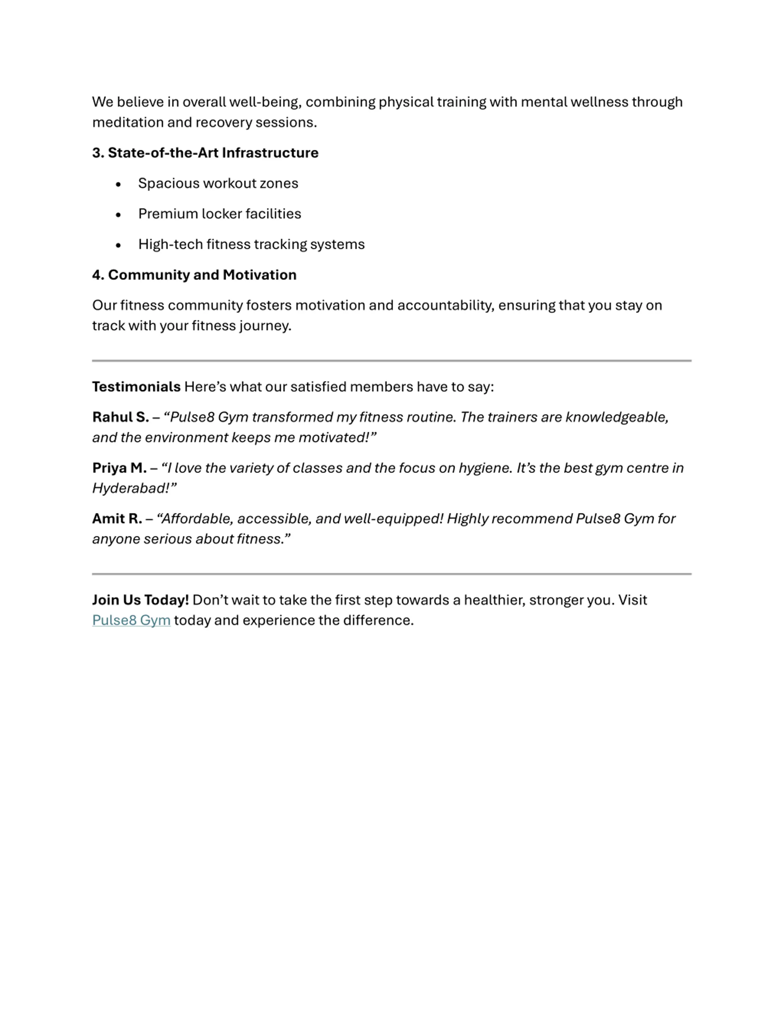 We believe in overall well-being, combining physical training with mental wellness through meditation and recovery sessions. 3. State-of-the-Art Infrastructure Spacious workout zones Premium locker facilities High-tech fitness tracking systems 4. Community and Motivation Our fitness community fosters motivation and accountability, ensuring that you stay on track with your fitness journey. Testimonials Here s what our satisfied members have to say: Rahul S. Pulse8 Gym transformed my fitness routine. The trainers are knowledgeable, and the environment keeps me motivated! Priya M. I love the variety of classes and the focus on hygiene. It s the best gym centre in Hyderabad! Amit R. Affordable, accessible, and well-equipped! Highly recommend Pulse8 Gym for anyone serious about fitness. Join Us Today! Don t wait to take the first step towards a healthier, stronger you. Visit Pulse8 Gym today and experience the difference.