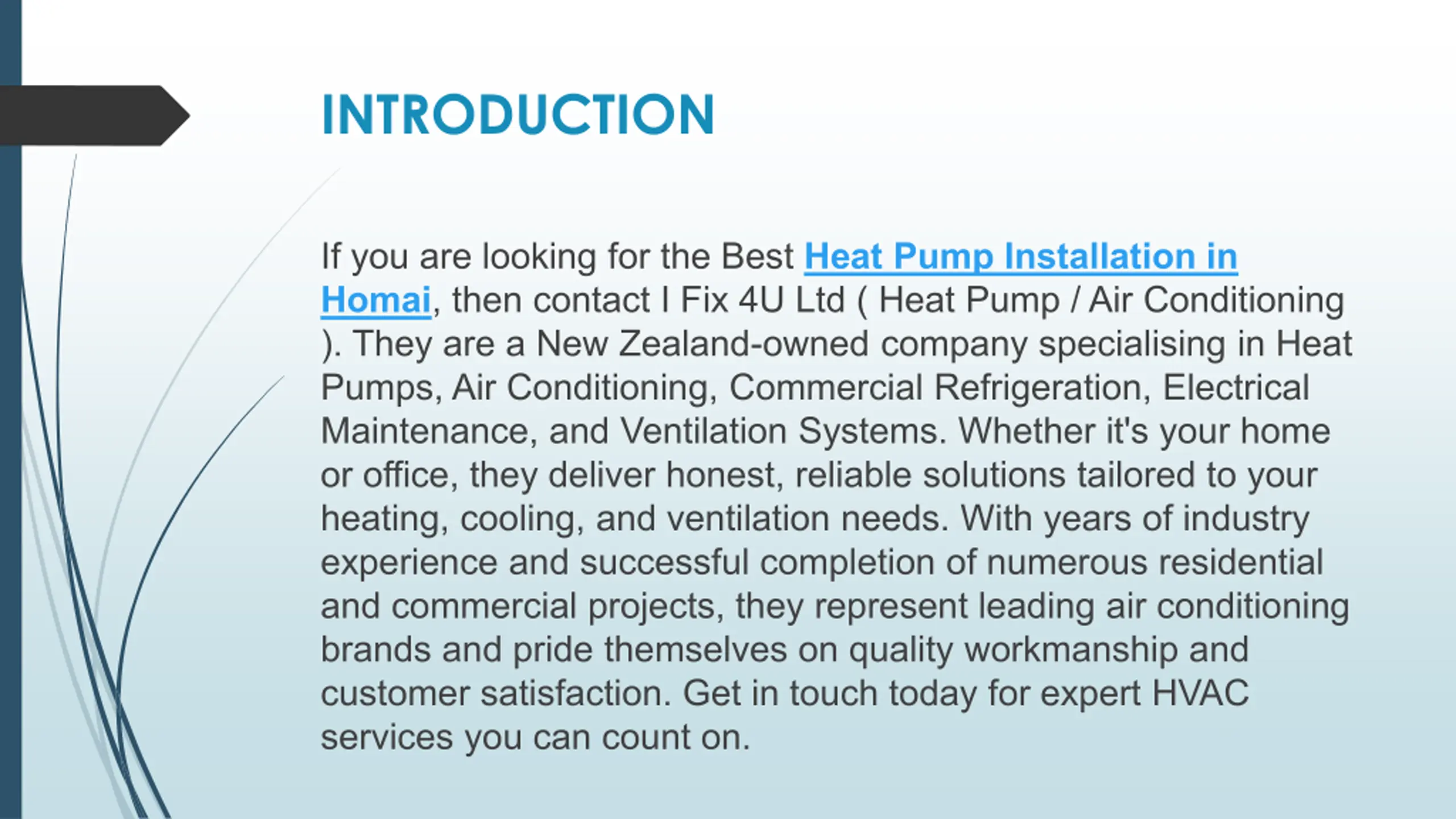 INTRODUCTION If you are looking for the Best Heat Pump Installation in Homai, then contact I Fix 4U Ltd ( Heat Pump / Air Conditioning ). They are a New Zealand-owned company specialising in Heat Pumps, Air Conditioning, Commercial Refrigeration, Electrical Maintenance, and Ventilation Systems. Whether it's your home or office, they deliver honest, reliable solutions tailored to your heating, cooling, and ventilation needs. With years of industry experience and successful completion of numerous residential and commercial projects, they represent leading air conditioning brands and pride themselves on quality workmanship and customer satisfaction. Get in touch today for expert HVAC services you can count on.