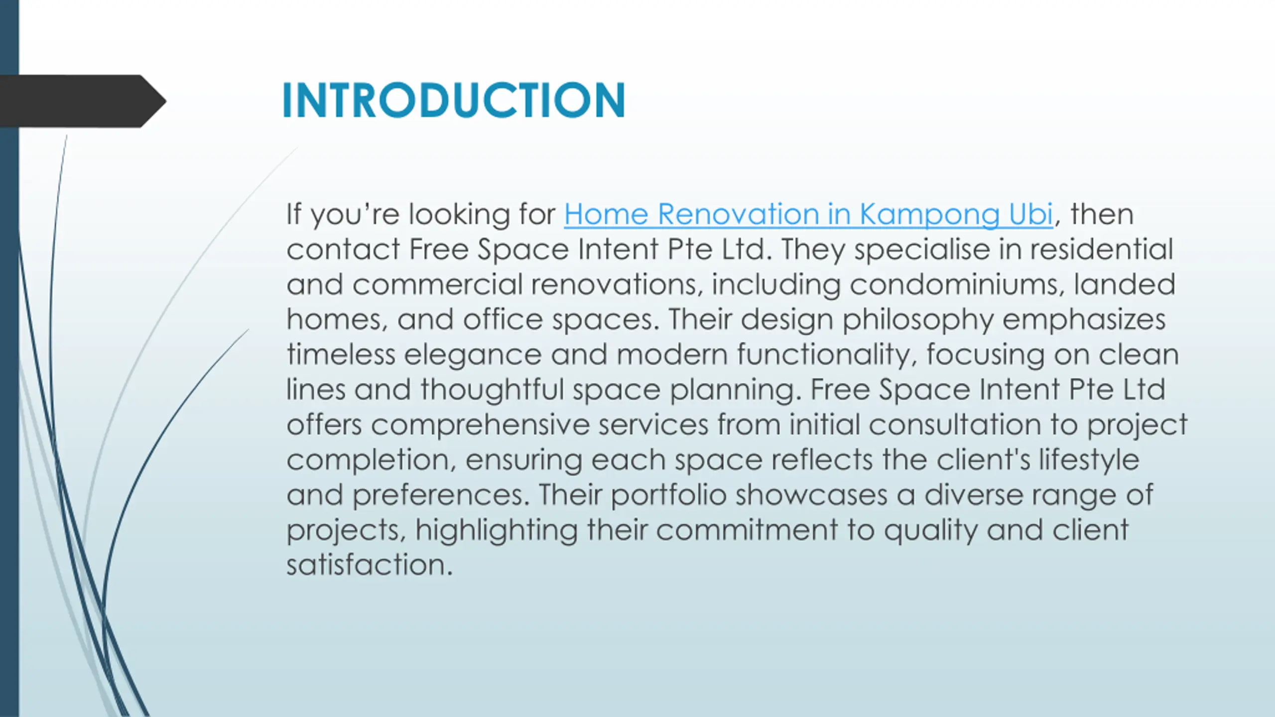 INTRODUCTION If you re looking for Home Renovation in Kampong Ubi, then contact Free Space Intent Pte Ltd. They specialise in residential and commercial renovations, including condominiums, landed homes, and office spaces. Their design philosophy emphasizes timeless elegance and modern functionality, focusing on clean lines and thoughtful space planning. Free Space Intent Pte Ltd offers comprehensive services from initial consultation to project completion, ensuring each space reflects the client's lifestyle and preferences. Their portfolio showcases a diverse range of projects, highlighting their commitment to quality and client satisfaction.