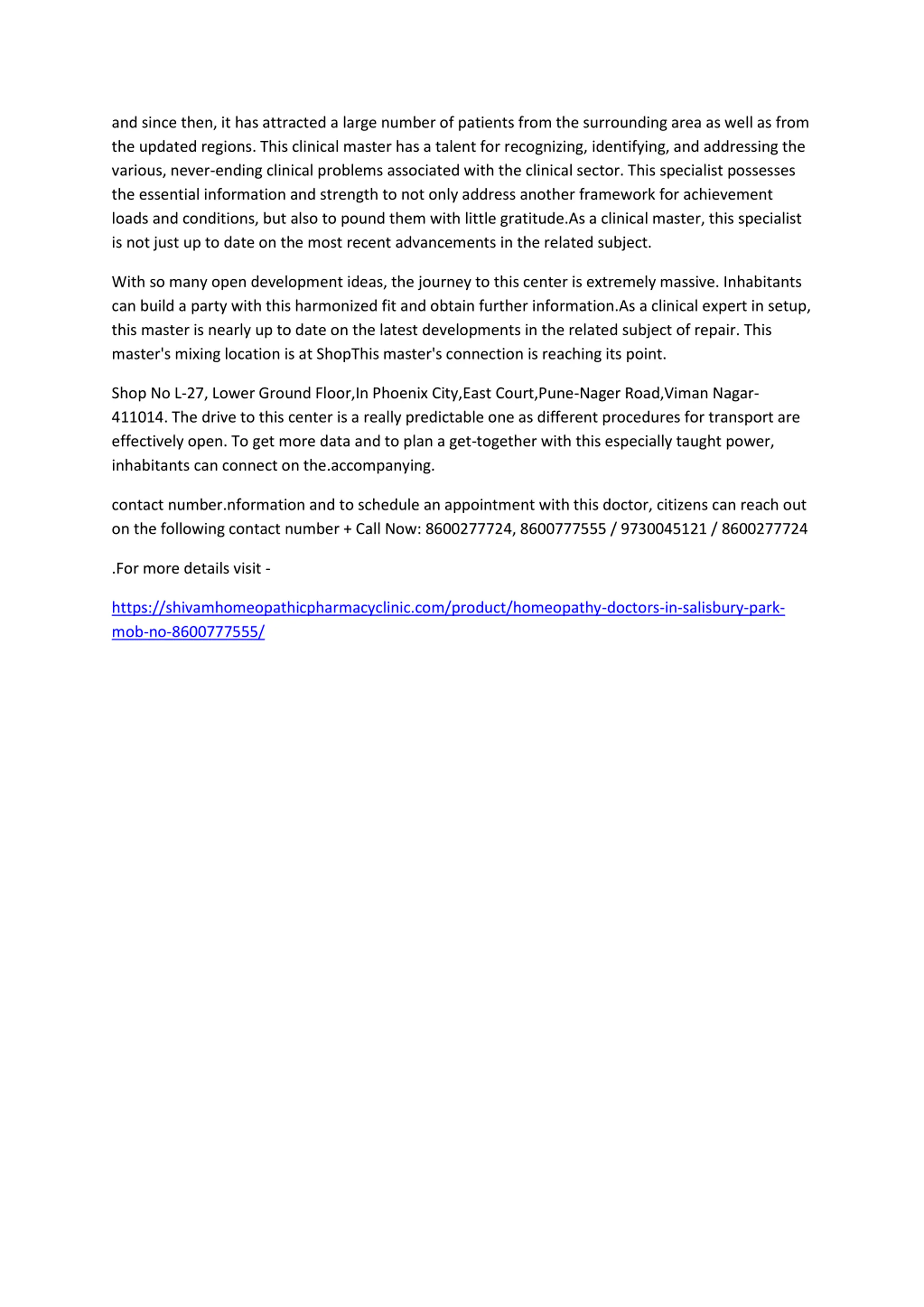and since then, it has attracted a large number of patients from the surrounding area as well as from the updated regions. This clinical master has a talent for recognizing, identifying, and addressing the various, never-ending clinical problems associated with the clinical sector. This specialist possesses the essential information and strength to not only address another framework for achievement loads and conditions, but also to pound them with little gratitude.As a clinical master, this specialist is not just up to date on the most recent advancements in the related subject. With so many open development ideas, the journey to this center is extremely massive. Inhabitants can build a party with this harmonized fit and obtain further information.As a clinical expert in setup, this master is nearly up to date on the latest developments in the related subject of repair. This master's mixing location is at ShopThis master's connection is reaching its point. Shop No L-27, Lower Ground Floor,In Phoenix City,East Court,Pune-Nager Road,Viman Nagar- 411014. The drive to this center is a really predictable one as different procedures for transport are effectively open. To get more data and to plan a get-together with this especially taught power, inhabitants can connect on the.accompanying. contact number.nformation and to schedule an appointment with this doctor, citizens can reach out on the following contact number + Call Now: 8600277724, 8600777555 / 9730045121 / 8600277724 .For more details visit - https://shivamhomeopathicpharmacyclinic.com/product/homeopathy-doctors-in-salisbury-park- mob-no-8600777555/