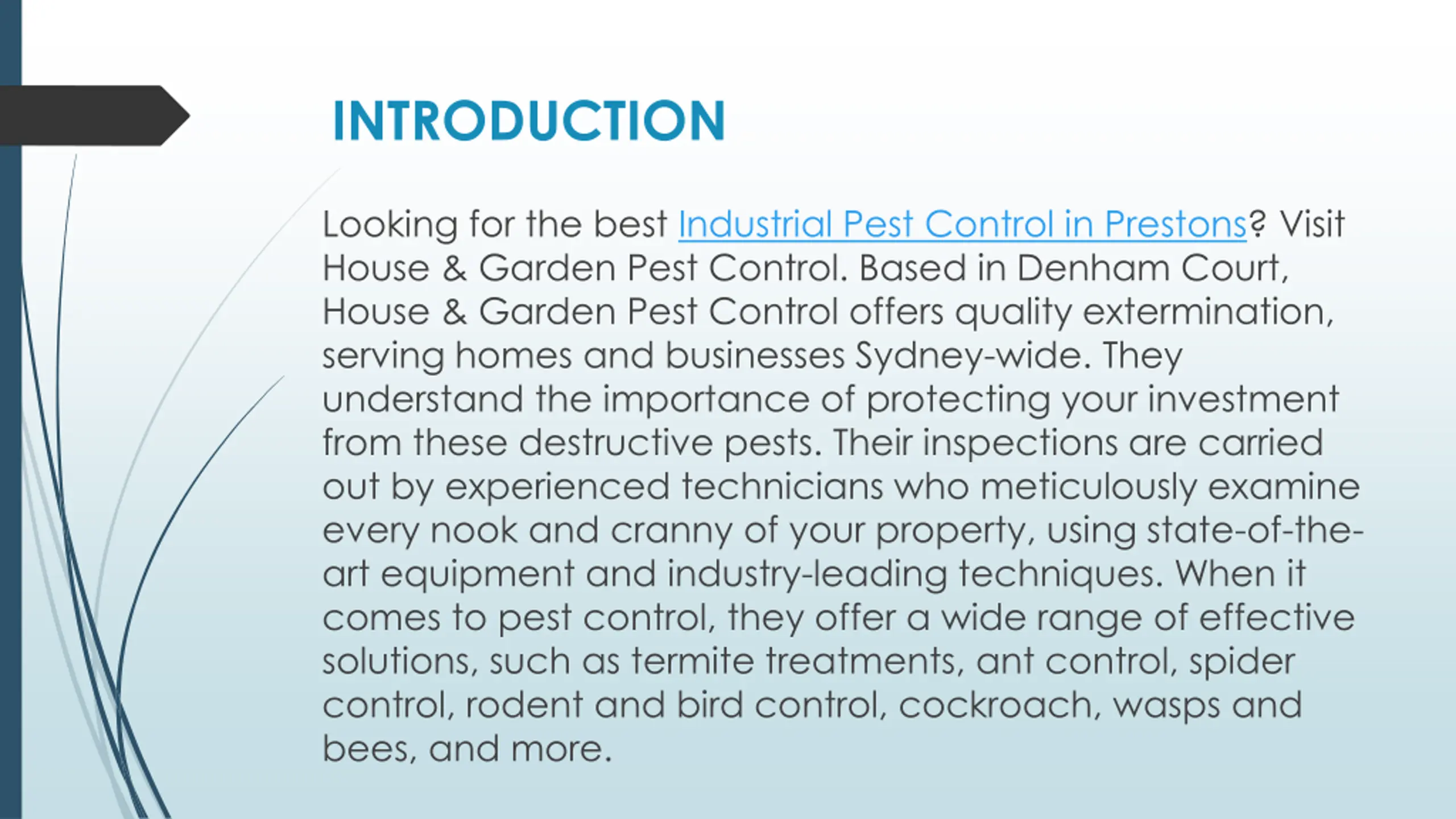 INTRODUCTION Looking for the best Industrial Pest Control in Prestons? Visit House & Garden Pest Control. Based in Denham Court, House & Garden Pest Control offers quality extermination, serving homes and businesses Sydney-wide. They understand the importance of protecting your investment from these destructive pests. Their inspections are carried out by experienced technicians who meticulously examine every nook and cranny of your property, using state-of-the- art equipment and industry-leading techniques. When it comes to pest control, they offer a wide range of effective solutions, such as termite treatments, ant control, spider control, rodent and bird control, cockroach, wasps and bees, and more.