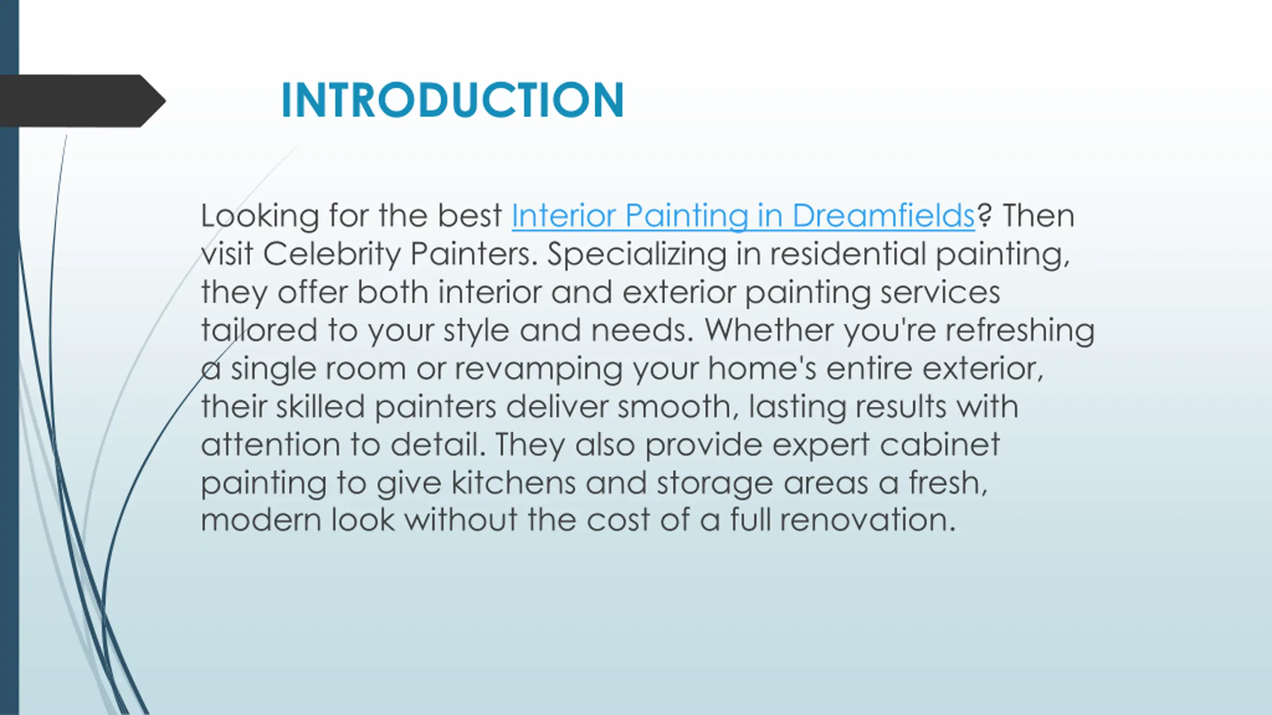 INTRODUCTION Looking for the best Interior Painting in Dreamfields? Then visit Celebrity Painters. Specializing in residential painting, they offer both interior and exterior painting services tailored to your style and needs. Whether you're refreshing a single room or revamping your home's entire exterior, their skilled painters deliver smooth, lasting results with attention to detail. They also provide expert cabinet painting to give kitchens and storage areas a fresh, modern look without the cost of a full renovation.