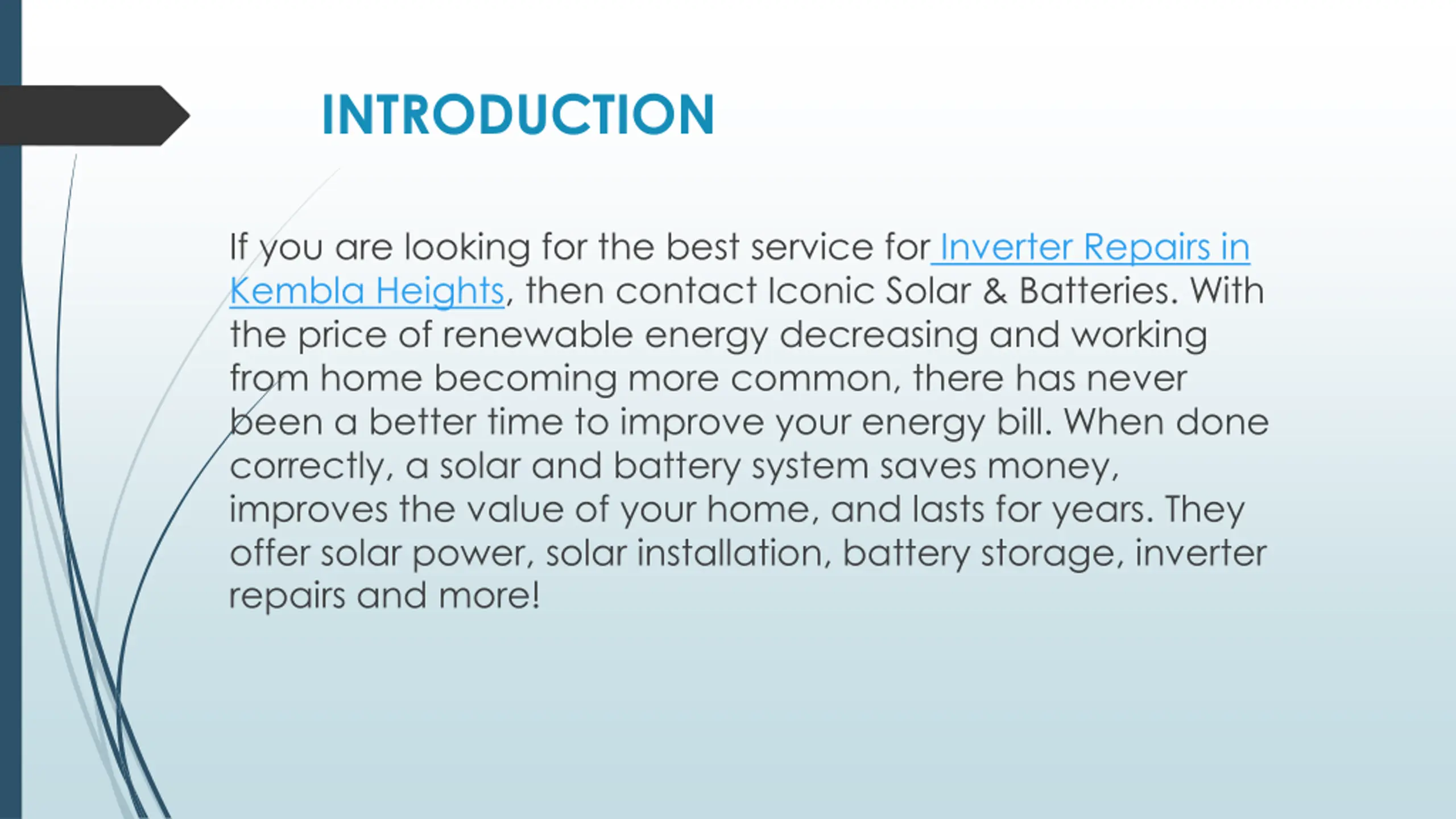 INTRODUCTION If you are looking for the best service for Inverter Repairs in Kembla Heights, then contact Iconic Solar & Batteries. With the price of renewable energy decreasing and working from home becoming more common, there has never been a better time to improve your energy bill. When done correctly, a solar and battery system saves money, improves the value of your home, and lasts for years. They offer solar power, solar installation, battery storage, inverter repairs and more!