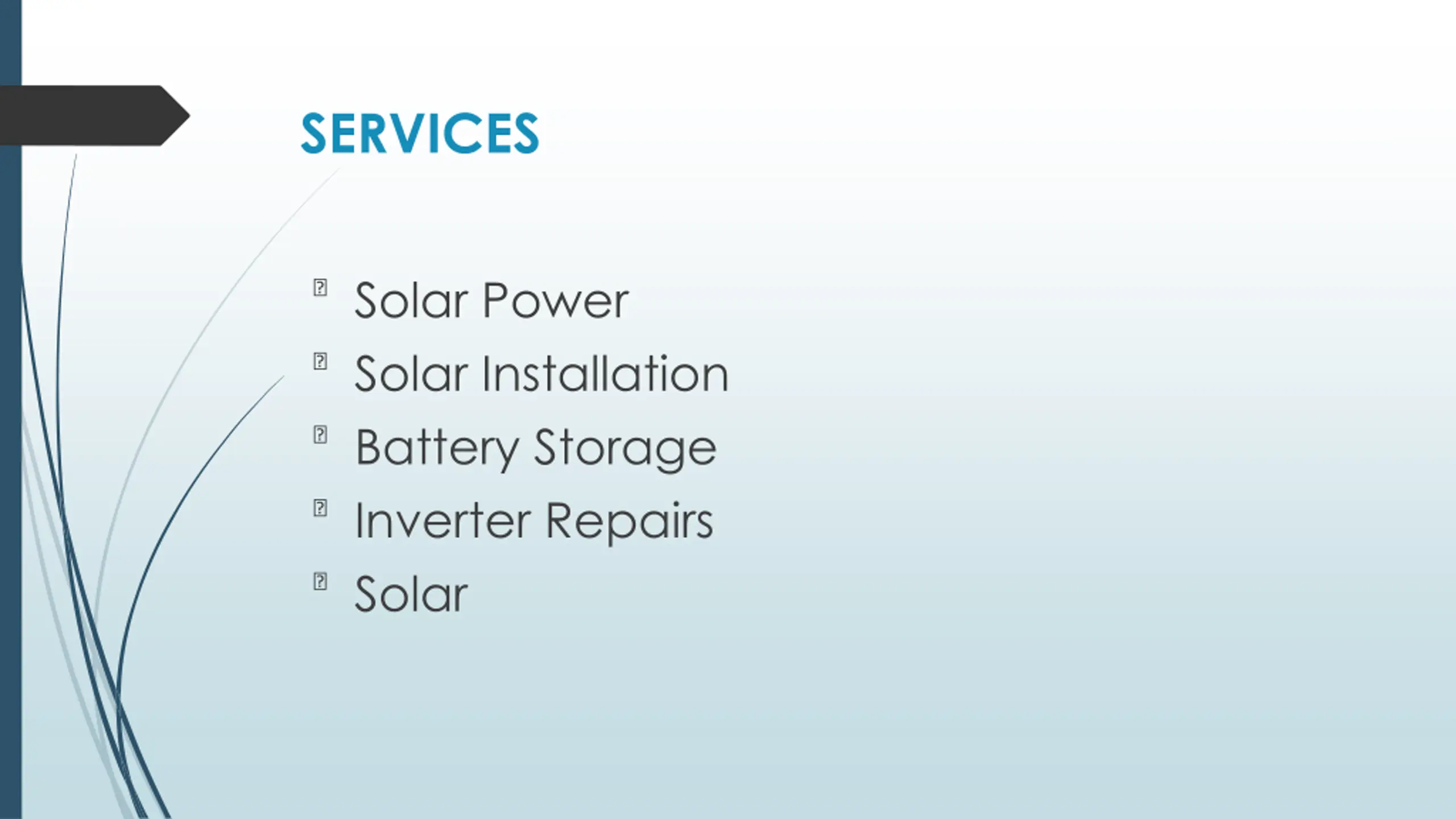 SERVICES ?Solar Power ?Solar Installation ?Battery Storage ?Inverter Repairs ?Solar