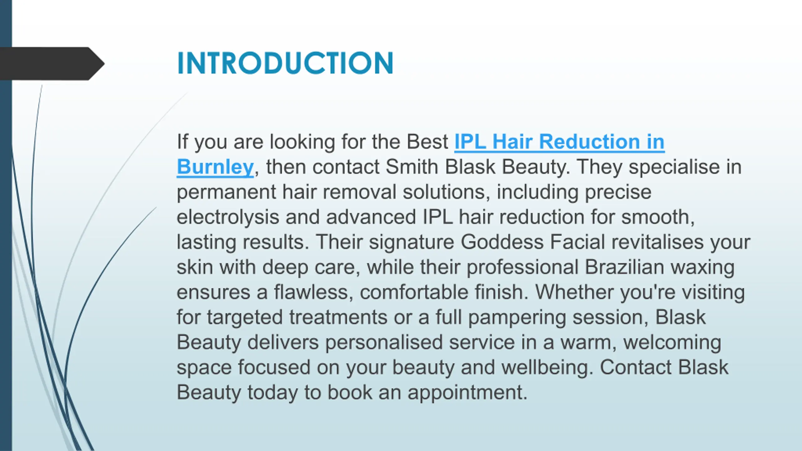 INTRODUCTION If you are looking for the Best IPL Hair Reduction in Burnley, then contact Smith Blask Beauty. They specialise in permanent hair removal solutions, including precise electrolysis and advanced IPL hair reduction for smooth, lasting results. Their signature Goddess Facial revitalises your skin with deep care, while their professional Brazilian waxing ensures a flawless, comfortable finish. Whether you're visiting for targeted treatments or a full pampering session, Blask Beauty delivers personalised service in a warm, welcoming space focused on your beauty and wellbeing. Contact Blask Beauty today to book an appointment.