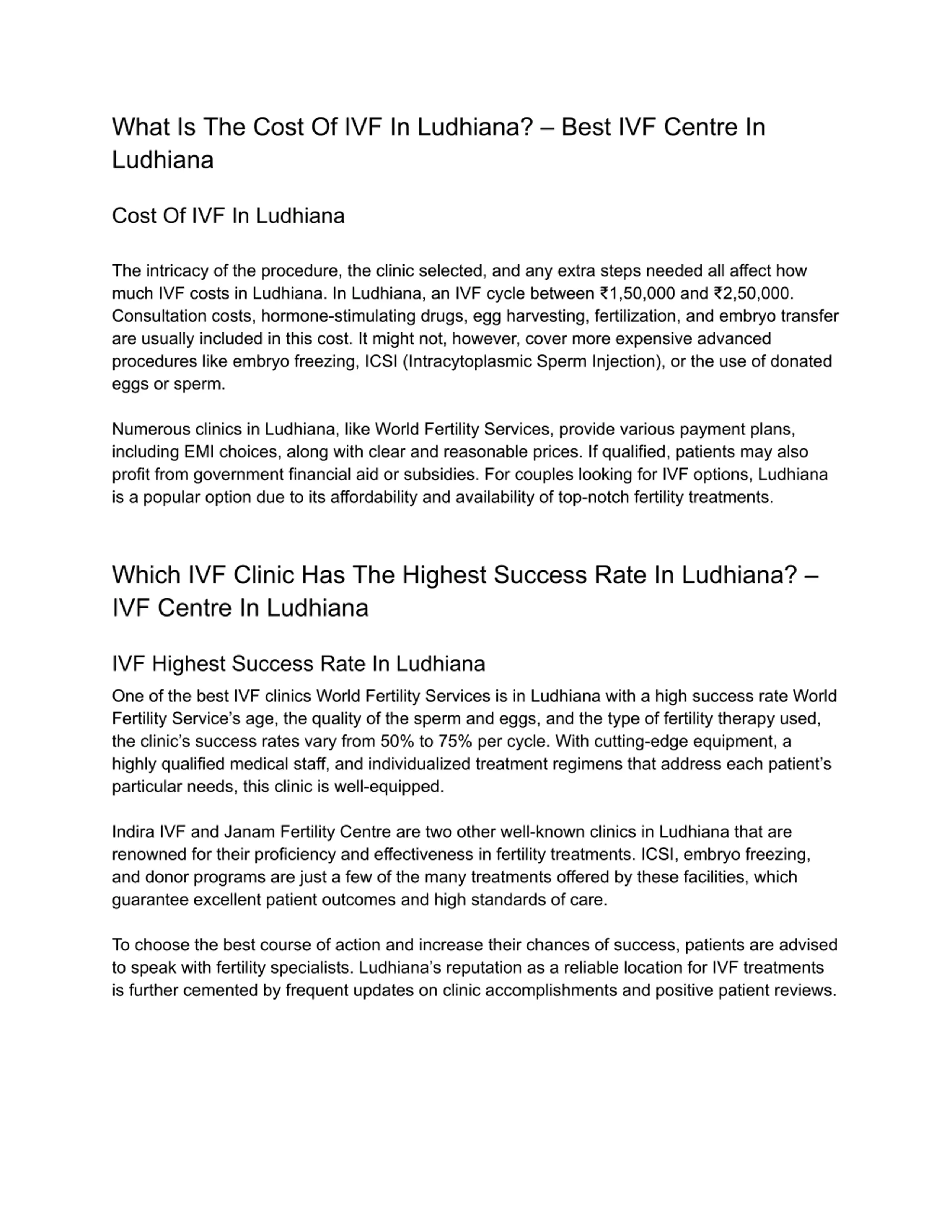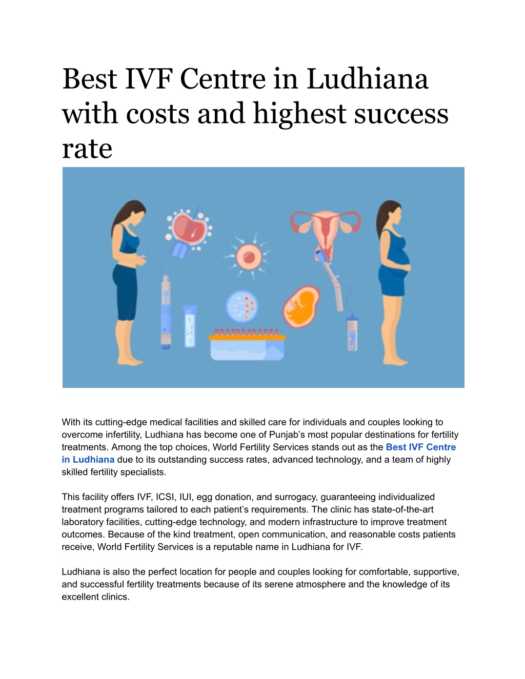 Best IVF Centre in Ludhiana with costs and highest success rate With its cutting-edge medical facilities and skilled care for individuals and couples looking to overcome infertility, Ludhiana has become one of Punjab s most popular destinations for fertility treatments. Among the top choices, World Fertility Services stands out as the Best IVF Centre in Ludhiana due to its outstanding success rates, advanced technology, and a team of highly skilled fertility specialists. This facility offers IVF, ICSI, IUI, egg donation, and surrogacy, guaranteeing individualized treatment programs tailored to each patient s requirements. The clinic has state-of-the-art laboratory facilities, cutting-edge technology, and modern infrastructure to improve treatment outcomes. Because of the kind treatment, open communication, and reasonable costs patients receive, World Fertility Services is a reputable name in Ludhiana for IVF. Ludhiana is also the perfect location for people and couples looking for comfortable, supportive, and successful fertility treatments because of its serene atmosphere and the knowledge of its excellent clinics.