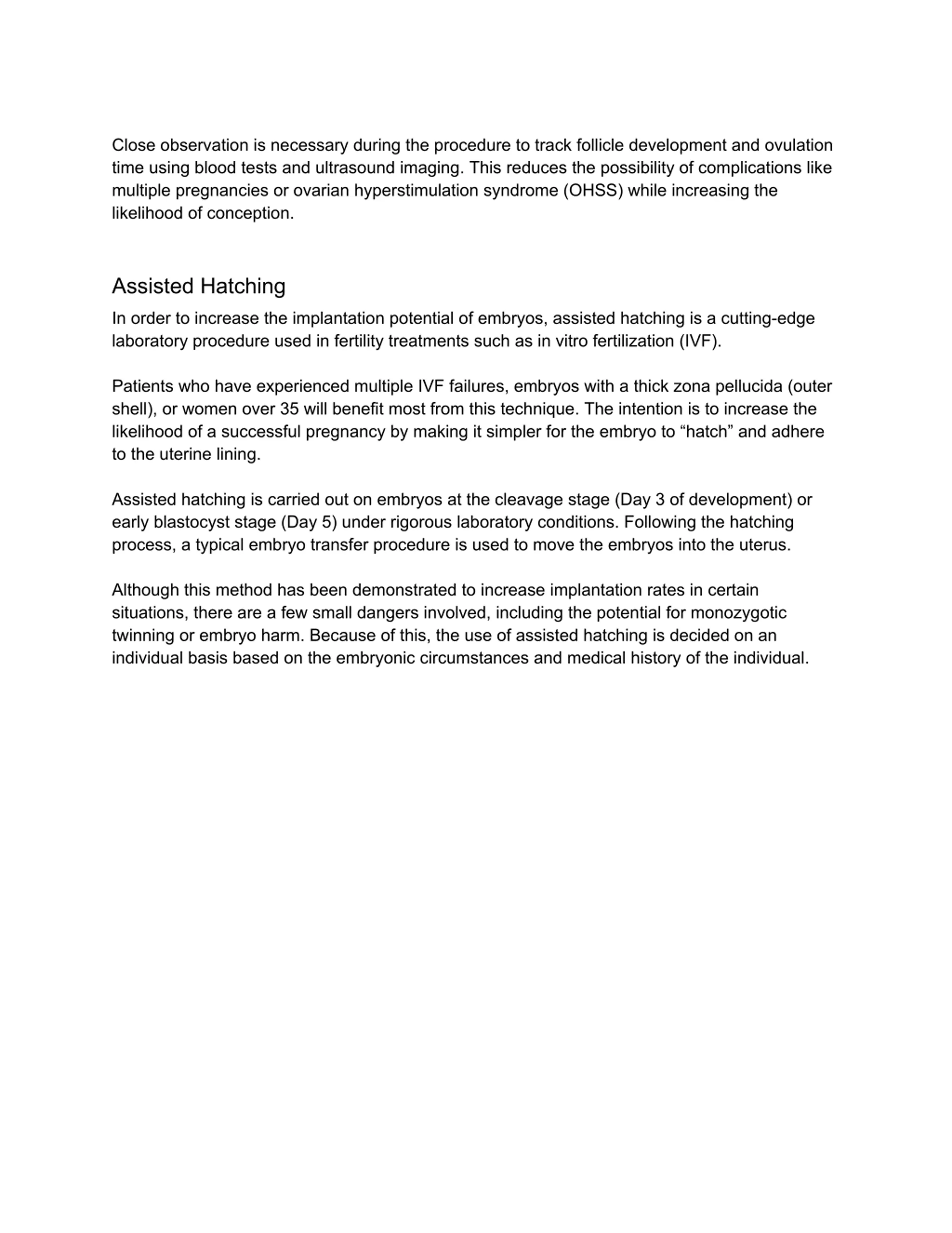 Close observation is necessary during the procedure to track follicle development and ovulation time using blood tests and ultrasound imaging. This reduces the possibility of complications like multiple pregnancies or ovarian hyperstimulation syndrome (OHSS) while increasing the likelihood of conception. Assisted Hatching In order to increase the implantation potential of embryos, assisted hatching is a cutting-edge laboratory procedure used in fertility treatments such as in vitro fertilization (IVF). Patients who have experienced multiple IVF failures, embryos with a thick zona pellucida (outer shell), or women over 35 will benefit most from this technique. The intention is to increase the likelihood of a successful pregnancy by making it simpler for the embryo to hatch and adhere to the uterine lining. Assisted hatching is carried out on embryos at the cleavage stage (Day 3 of development) or early blastocyst stage (Day 5) under rigorous laboratory conditions. Following the hatching process, a typical embryo transfer procedure is used to move the embryos into the uterus. Although this method has been demonstrated to increase implantation rates in certain situations, there are a few small dangers involved, including the potential for monozygotic twinning or embryo harm. Because of this, the use of assisted hatching is decided on an individual basis based on the embryonic circumstances and medical history of the individual.