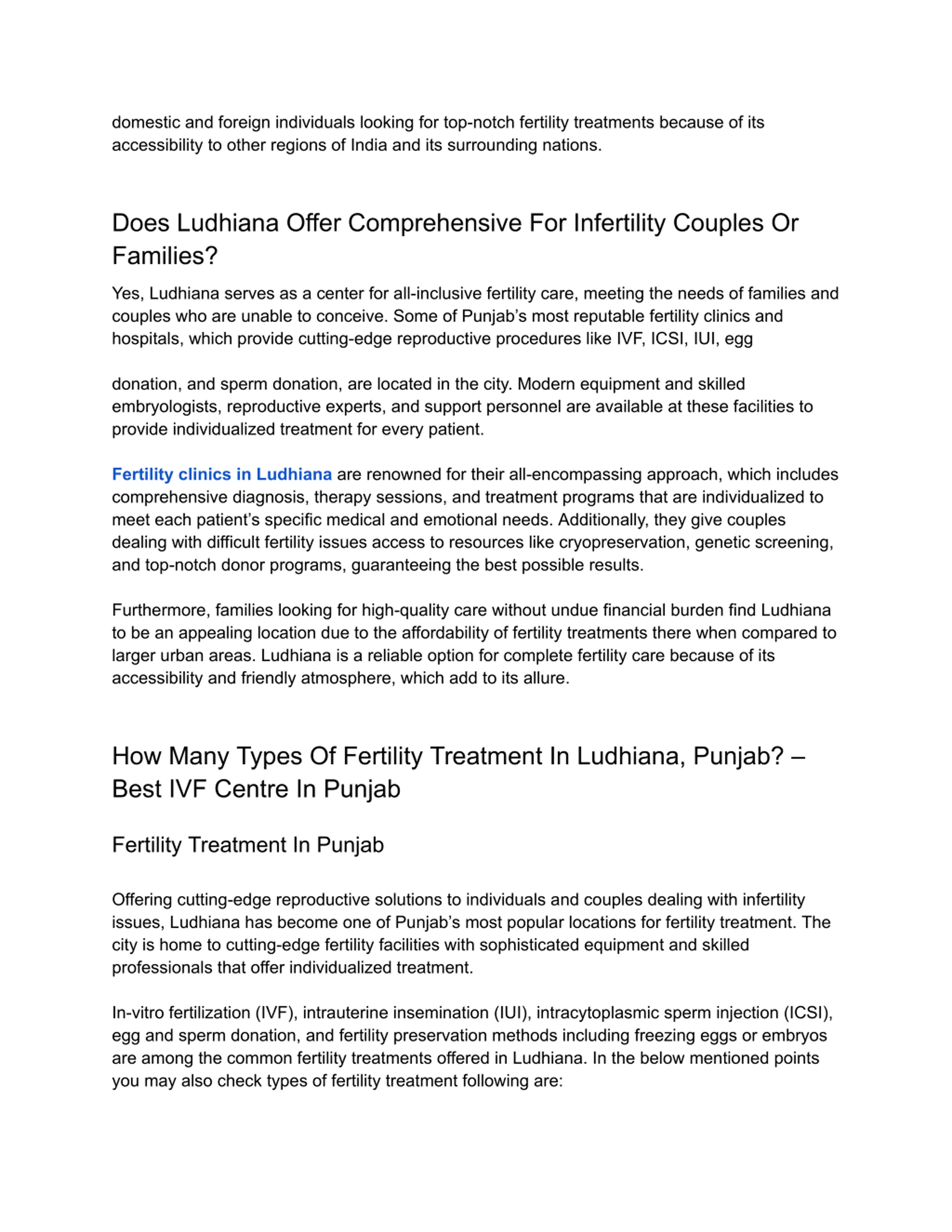 domestic and foreign individuals looking for top-notch fertility treatments because of its accessibility to other regions of India and its surrounding nations. Does Ludhiana Offer Comprehensive For Infertility Couples Or Families? Yes, Ludhiana serves as a center for all-inclusive fertility care, meeting the needs of families and couples who are unable to conceive. Some of Punjab s most reputable fertility clinics and hospitals, which provide cutting-edge reproductive procedures like IVF, ICSI, IUI, egg donation, and sperm donation, are located in the city. Modern equipment and skilled embryologists, reproductive experts, and support personnel are available at these facilities to provide individualized treatment for every patient. Fertility clinics in Ludhiana are renowned for their all-encompassing approach, which includes comprehensive diagnosis, therapy sessions, and treatment programs that are individualized to meet each patient s specific medical and emotional needs. Additionally, they give couples dealing with difficult fertility issues access to resources like cryopreservation, genetic screening, and top-notch donor programs, guaranteeing the best possible results. Furthermore, families looking for high-quality care without undue financial burden find Ludhiana to be an appealing location due to the affordability of fertility treatments there when compared to larger urban areas. Ludhiana is a reliable option for complete fertility care because of its accessibility and friendly atmosphere, which add to its allure. How Many Types Of Fertility Treatment In Ludhiana, Punjab? Best IVF Centre In Punjab Fertility Treatment In Punjab Offering cutting-edge reproductive solutions to individuals and couples dealing with infertility issues, Ludhiana has become one of Punjab s most popular locations for fertility treatment. The city is home to cutting-edge fertility facilities with sophisticated equipment and skilled professionals that offer individualized treatment. In-vitro fertilization (IVF), intrauterine insemination (IUI), intracytoplasmic sperm injection (ICSI), egg and sperm donation, and fertility preservation methods including freezing eggs or embryos are among the common fertility treatments offered in Ludhiana. In the below mentioned points you may also check types of fertility treatment following are: