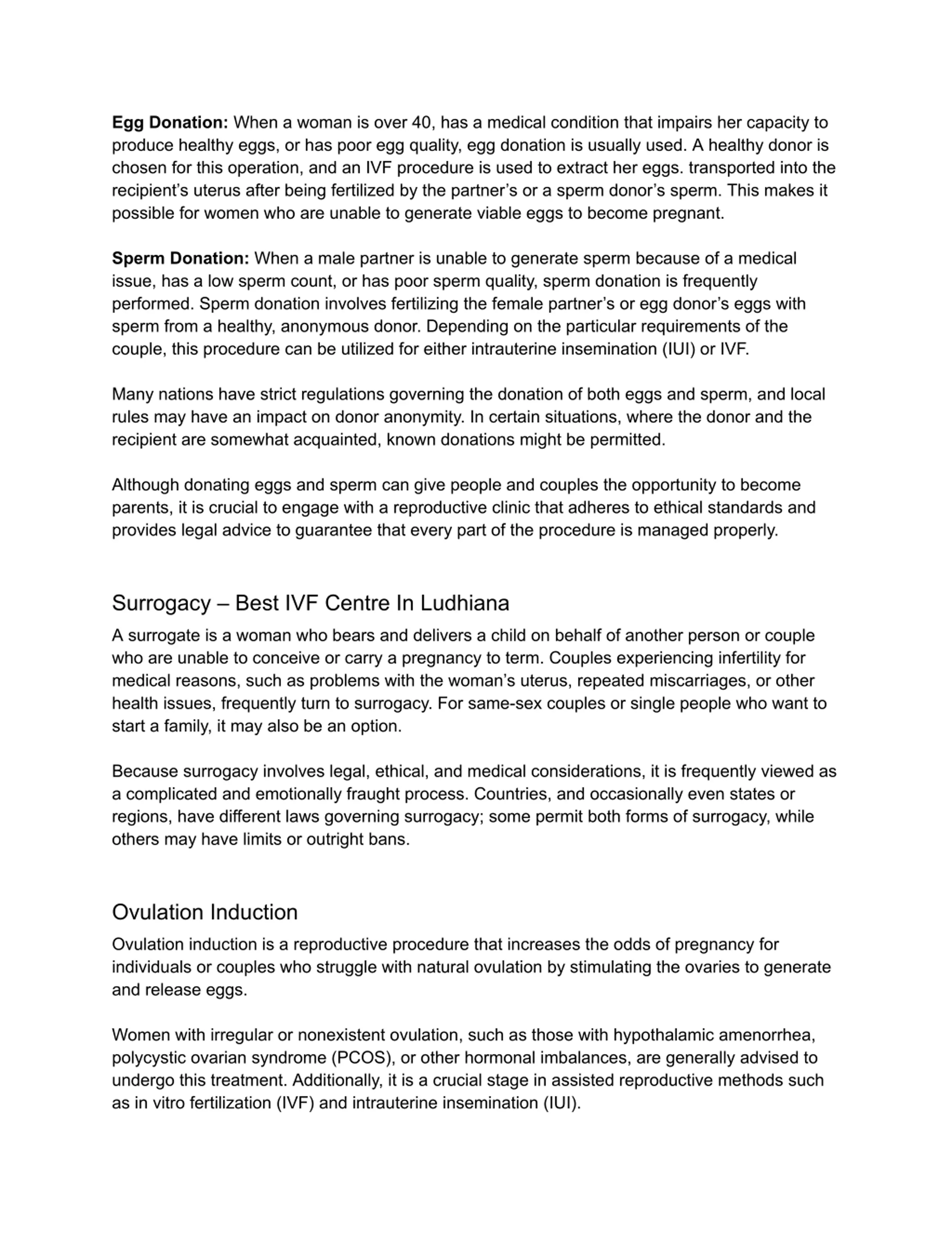 Egg Donation: When a woman is over 40, has a medical condition that impairs her capacity to produce healthy eggs, or has poor egg quality, egg donation is usually used. A healthy donor is chosen for this operation, and an IVF procedure is used to extract her eggs. transported into the recipient s uterus after being fertilized by the partner s or a sperm donor s sperm. This makes it possible for women who are unable to generate viable eggs to become pregnant. Sperm Donation: When a male partner is unable to generate sperm because of a medical issue, has a low sperm count, or has poor sperm quality, sperm donation is frequently performed. Sperm donation involves fertilizing the female partner s or egg donor s eggs with sperm from a healthy, anonymous donor. Depending on the particular requirements of the couple, this procedure can be utilized for either intrauterine insemination (IUI) or IVF. Many nations have strict regulations governing the donation of both eggs and sperm, and local rules may have an impact on donor anonymity. In certain situations, where the donor and the recipient are somewhat acquainted, known donations might be permitted. Although donating eggs and sperm can give people and couples the opportunity to become parents, it is crucial to engage with a reproductive clinic that adheres to ethical standards and provides legal advice to guarantee that every part of the procedure is managed properly. Surrogacy Best IVF Centre In Ludhiana A surrogate is a woman who bears and delivers a child on behalf of another person or couple who are unable to conceive or carry a pregnancy to term. Couples experiencing infertility for medical reasons, such as problems with the woman s uterus, repeated miscarriages, or other health issues, frequently turn to surrogacy. For same-sex couples or single people who want to start a family, it may also be an option. Because surrogacy involves legal, ethical, and medical considerations, it is frequently viewed as a complicated and emotionally fraught process. Countries, and occasionally even states or regions, have different laws governing surrogacy; some permit both forms of surrogacy, while others may have limits or outright bans. Ovulation Induction Ovulation induction is a reproductive procedure that increases the odds of pregnancy for individuals or couples who struggle with natural ovulation by stimulating the ovaries to generate and release eggs. Women with irregular or nonexistent ovulation, such as those with hypothalamic amenorrhea, polycystic ovarian syndrome (PCOS), or other hormonal imbalances, are generally advised to undergo this treatment. Additionally, it is a crucial stage in assisted reproductive methods such as in vitro fertilization (IVF) and intrauterine insemination (IUI).