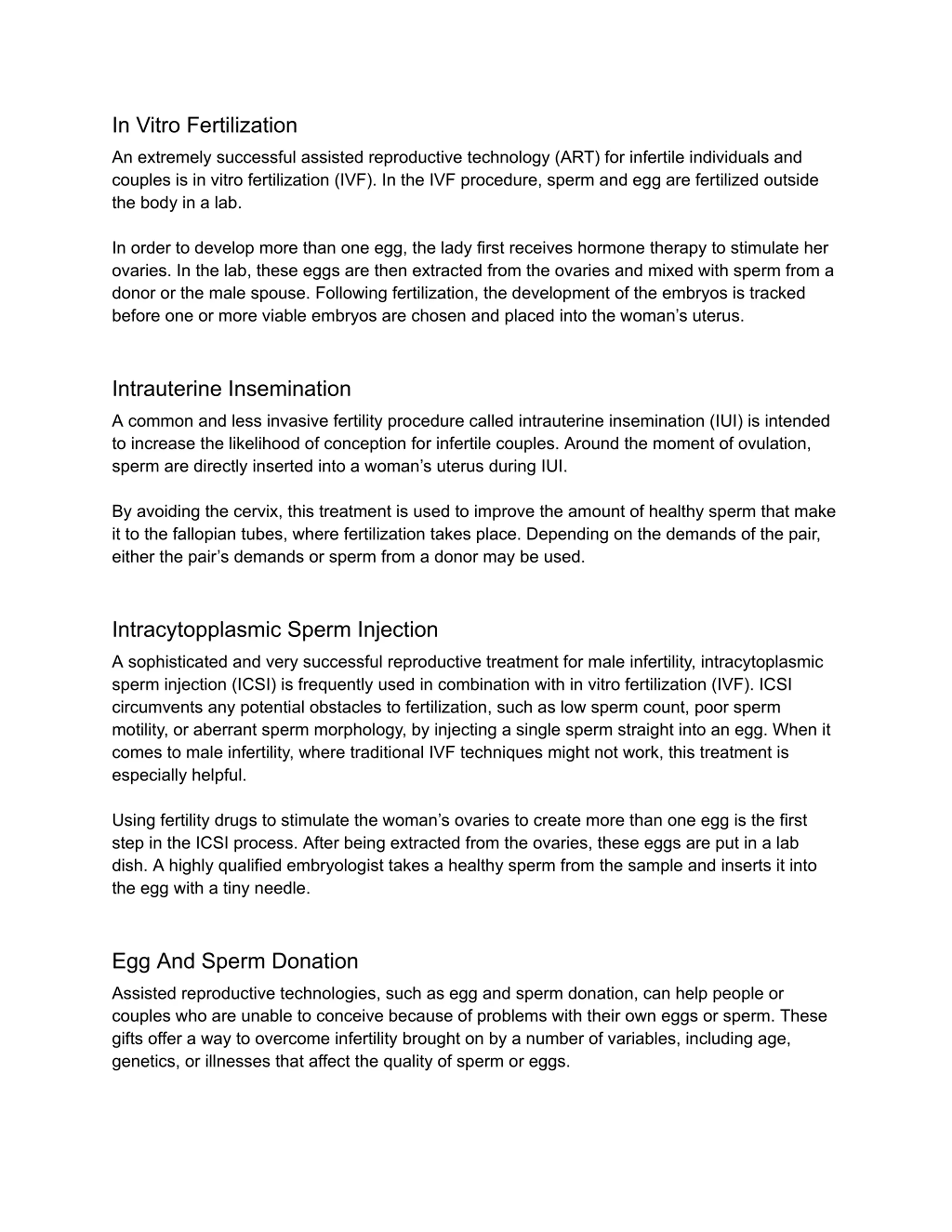 In Vitro Fertilization An extremely successful assisted reproductive technology (ART) for infertile individuals and couples is in vitro fertilization (IVF). In the IVF procedure, sperm and egg are fertilized outside the body in a lab. In order to develop more than one egg, the lady first receives hormone therapy to stimulate her ovaries. In the lab, these eggs are then extracted from the ovaries and mixed with sperm from a donor or the male spouse. Following fertilization, the development of the embryos is tracked before one or more viable embryos are chosen and placed into the woman s uterus. Intrauterine Insemination A common and less invasive fertility procedure called intrauterine insemination (IUI) is intended to increase the likelihood of conception for infertile couples. Around the moment of ovulation, sperm are directly inserted into a woman s uterus during IUI. By avoiding the cervix, this treatment is used to improve the amount of healthy sperm that make it to the fallopian tubes, where fertilization takes place. Depending on the demands of the pair, either the pair s demands or sperm from a donor may be used. Intracytopplasmic Sperm Injection A sophisticated and very successful reproductive treatment for male infertility, intracytoplasmic sperm injection (ICSI) is frequently used in combination with in vitro fertilization (IVF). ICSI circumvents any potential obstacles to fertilization, such as low sperm count, poor sperm motility, or aberrant sperm morphology, by injecting a single sperm straight into an egg. When it comes to male infertility, where traditional IVF techniques might not work, this treatment is especially helpful. Using fertility drugs to stimulate the woman s ovaries to create more than one egg is the first step in the ICSI process. After being extracted from the ovaries, these eggs are put in a lab dish. A highly qualified embryologist takes a healthy sperm from the sample and inserts it into the egg with a tiny needle. Egg And Sperm Donation Assisted reproductive technologies, such as egg and sperm donation, can help people or couples who are unable to conceive because of problems with their own eggs or sperm. These gifts offer a way to overcome infertility brought on by a number of variables, including age, genetics, or illnesses that affect the quality of sperm or eggs.