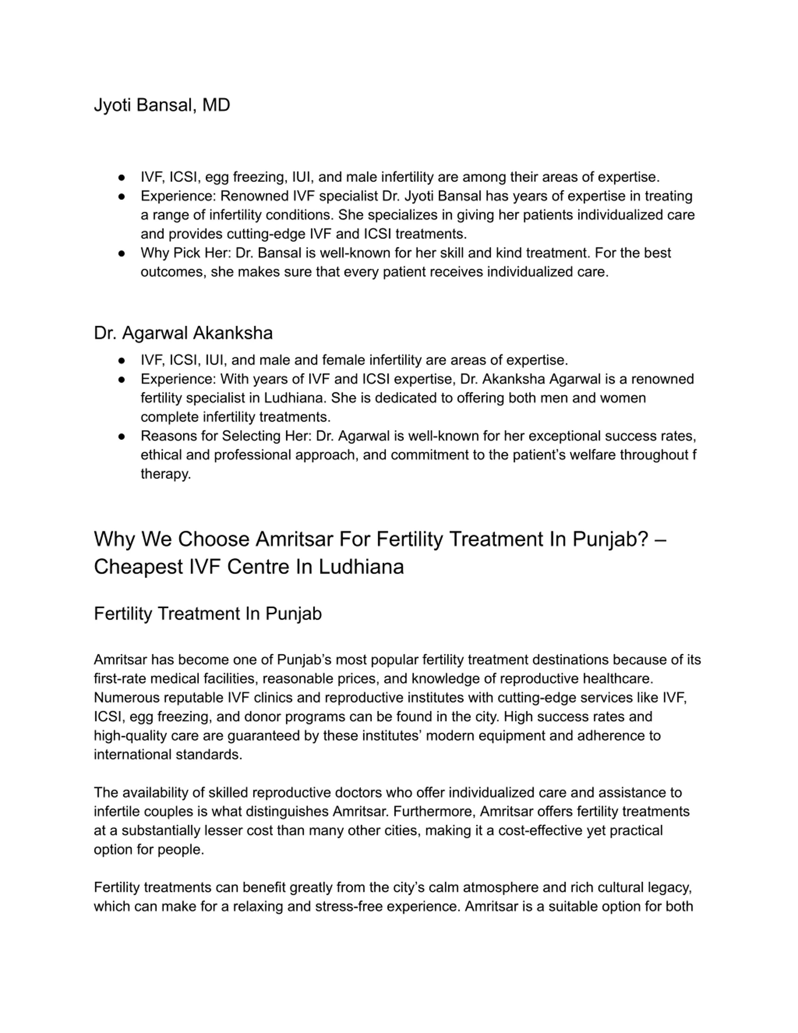 Jyoti Bansal, MD IVF, ICSI, egg freezing, IUI, and male infertility are among their areas of expertise. Experience: Renowned IVF specialist Dr. Jyoti Bansal has years of expertise in treating a range of infertility conditions. She specializes in giving her patients individualized care and provides cutting-edge IVF and ICSI treatments. Why Pick Her: Dr. Bansal is well-known for her skill and kind treatment. For the best outcomes, she makes sure that every patient receives individualized care. Dr. Agarwal Akanksha IVF, ICSI, IUI, and male and female infertility are areas of expertise. Experience: With years of IVF and ICSI expertise, Dr. Akanksha Agarwal is a renowned fertility specialist in Ludhiana. She is dedicated to offering both men and women complete infertility treatments. Reasons for Selecting Her: Dr. Agarwal is well-known for her exceptional success rates, ethical and professional approach, and commitment to the patient s welfare throughout f therapy. Why We Choose Amritsar For Fertility Treatment In Punjab? Cheapest IVF Centre In Ludhiana Fertility Treatment In Punjab Amritsar has become one of Punjab s most popular fertility treatment destinations because of its first-rate medical facilities, reasonable prices, and knowledge of reproductive healthcare. Numerous reputable IVF clinics and reproductive institutes with cutting-edge services like IVF, ICSI, egg freezing, and donor programs can be found in the city. High success rates and high-quality care are guaranteed by these institutes modern equipment and adherence to international standards. The availability of skilled reproductive doctors who offer individualized care and assistance to infertile couples is what distinguishes Amritsar. Furthermore, Amritsar offers fertility treatments at a substantially lesser cost than many other cities, making it a cost-effective yet practical option for people. Fertility treatments can benefit greatly from the city s calm atmosphere and rich cultural legacy, which can make for a relaxing and stress-free experience. Amritsar is a suitable option for both