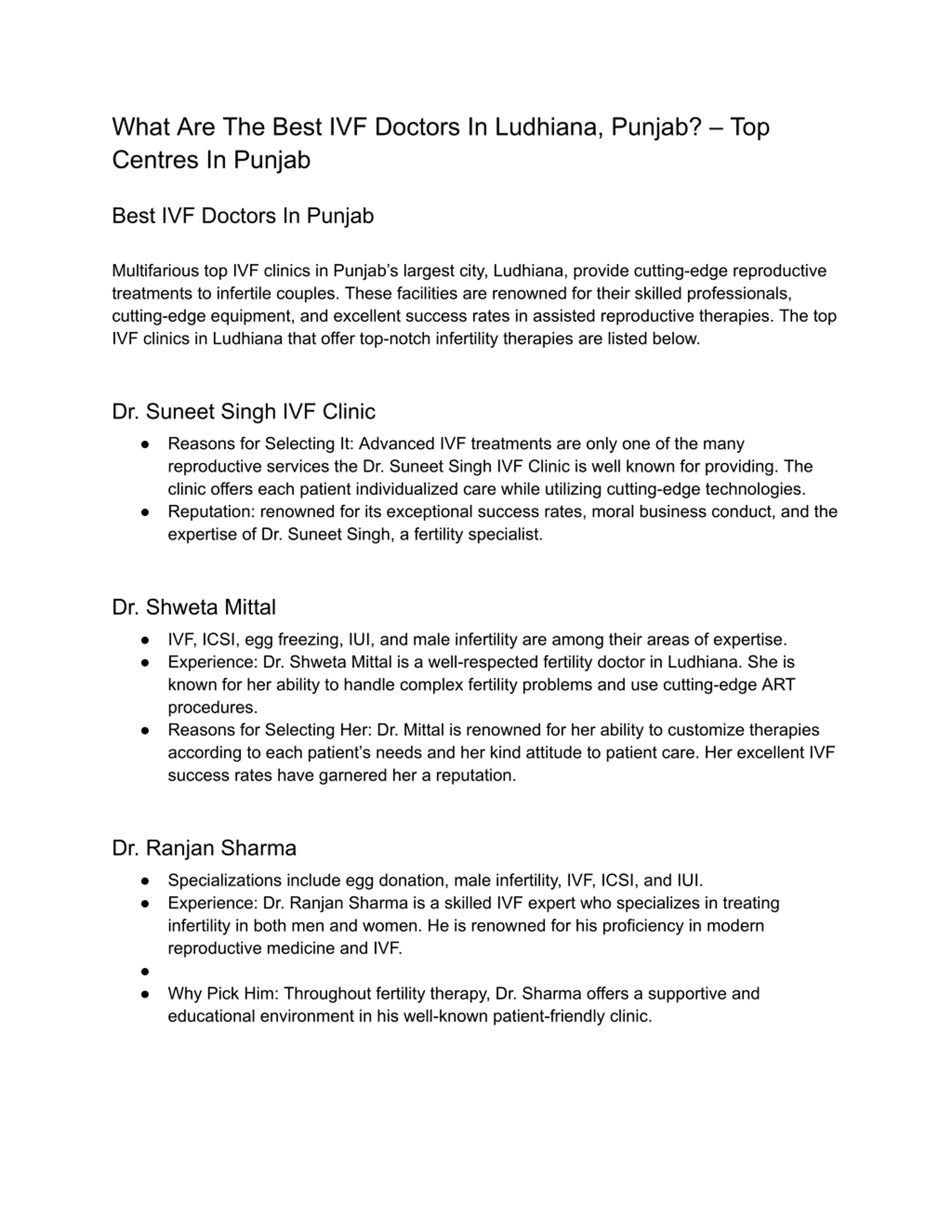 What Are The Best IVF Doctors In Ludhiana, Punjab? Top Centres In Punjab Best IVF Doctors In Punjab Multifarious top IVF clinics in Punjab s largest city, Ludhiana, provide cutting-edge reproductive treatments to infertile couples. These facilities are renowned for their skilled professionals, cutting-edge equipment, and excellent success rates in assisted reproductive therapies. The top IVF clinics in Ludhiana that offer top-notch infertility therapies are listed below. Dr. Suneet Singh IVF Clinic Reasons for Selecting It: Advanced IVF treatments are only one of the many reproductive services the Dr. Suneet Singh IVF Clinic is well known for providing. The clinic offers each patient individualized care while utilizing cutting-edge technologies. Reputation: renowned for its exceptional success rates, moral business conduct, and the expertise of Dr. Suneet Singh, a fertility specialist. Dr. Shweta Mittal IVF, ICSI, egg freezing, IUI, and male infertility are among their areas of expertise. Experience: Dr. Shweta Mittal is a well-respected fertility doctor in Ludhiana. She is known for her ability to handle complex fertility problems and use cutting-edge ART procedures. Reasons for Selecting Her: Dr. Mittal is renowned for her ability to customize therapies according to each patient s needs and her kind attitude to patient care. Her excellent IVF success rates have garnered her a reputation. Dr. Ranjan Sharma Specializations include egg donation, male infertility, IVF, ICSI, and IUI. Experience: Dr. Ranjan Sharma is a skilled IVF expert who specializes in treating infertility in both men and women. He is renowned for his proficiency in modern reproductive medicine and IVF. Why Pick Him: Throughout fertility therapy, Dr. Sharma offers a supportive and educational environment in his well-known patient-friendly clinic.