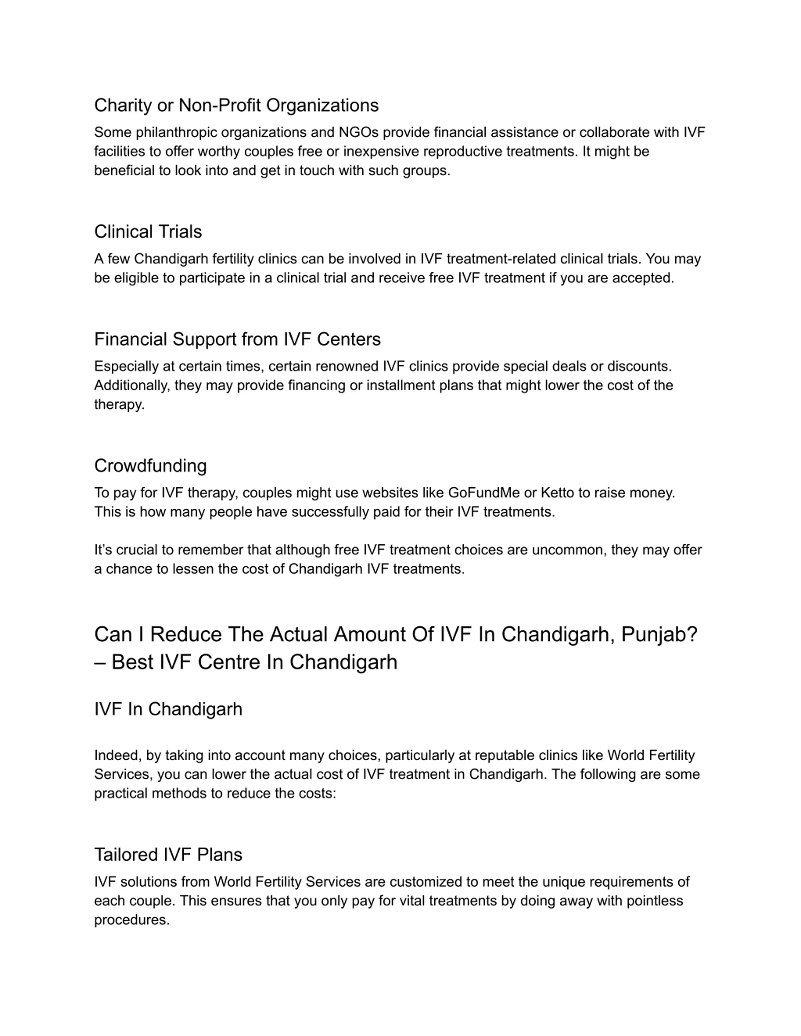 Charity or Non-Profit Organizations Some philanthropic organizations and NGOs provide financial assistance or collaborate with IVF facilities to offer worthy couples free or inexpensive reproductive treatments. It might be beneficial to look into and get in touch with such groups. Clinical Trials A few Chandigarh fertility clinics can be involved in IVF treatment-related clinical trials. You may be eligible to participate in a clinical trial and receive free IVF treatment if you are accepted. Financial Support from IVF Centers Especially at certain times, certain renowned IVF clinics provide special deals or discounts. Additionally, they may provide financing or installment plans that might lower the cost of the therapy. Crowdfunding To pay for IVF therapy, couples might use websites like GoFundMe or Ketto to raise money. This is how many people have successfully paid for their IVF treatments. It s crucial to remember that although free IVF treatment choices are uncommon, they may offer a chance to lessen the cost of Chandigarh IVF treatments. Can I Reduce The Actual Amount Of IVF In Chandigarh, Punjab? Best IVF Centre In Chandigarh IVF In Chandigarh Indeed, by taking into account many choices, particularly at reputable clinics like World Fertility Services, you can lower the actual cost of IVF treatment in Chandigarh. The following are some practical methods to reduce the costs: Tailored IVF Plans IVF solutions from World Fertility Services are customized to meet the unique requirements of each couple. This ensures that you only pay for vital treatments by doing away with pointless procedures.