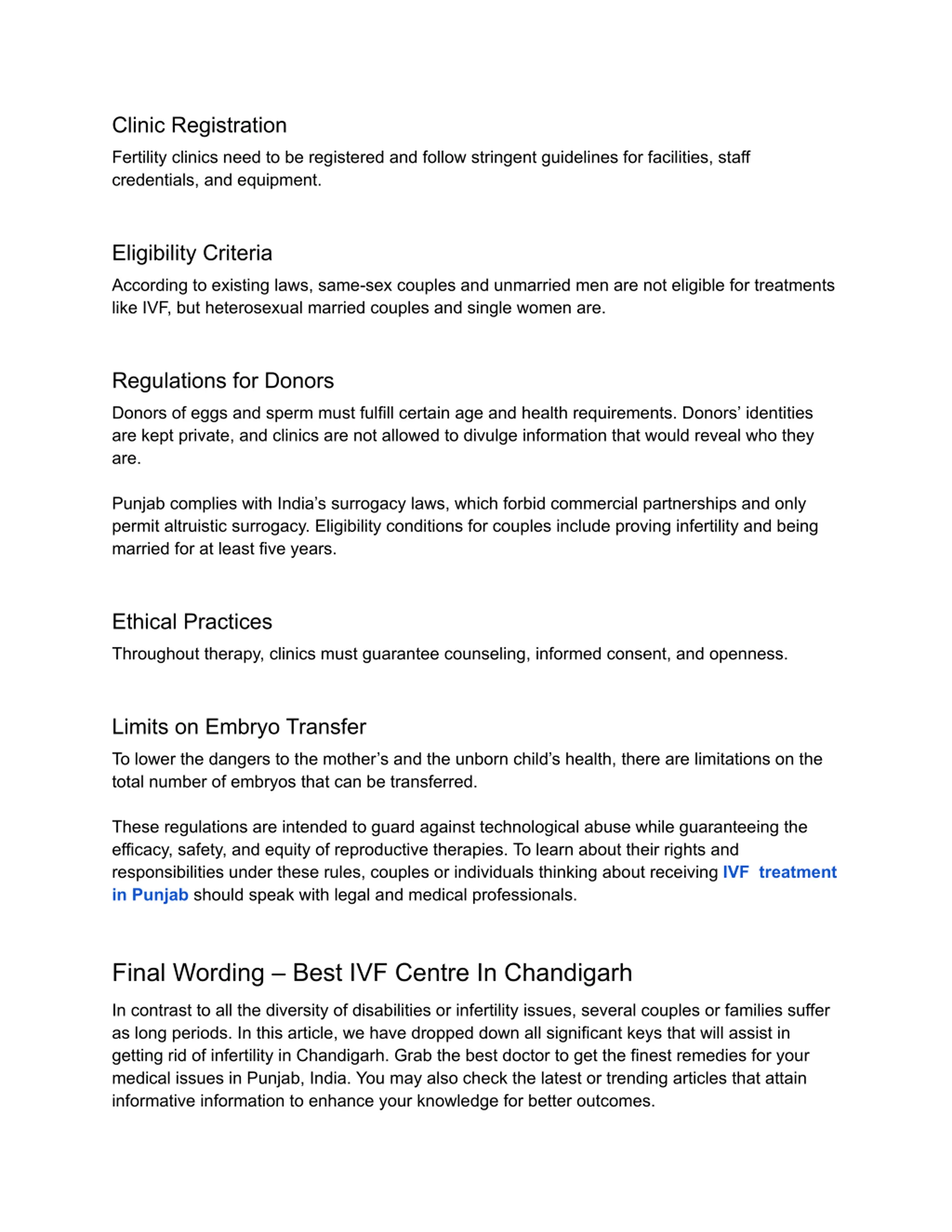Clinic Registration Fertility clinics need to be registered and follow stringent guidelines for facilities, staff credentials, and equipment. Eligibility Criteria According to existing laws, same-sex couples and unmarried men are not eligible for treatments like IVF, but heterosexual married couples and single women are. Regulations for Donors Donors of eggs and sperm must fulfill certain age and health requirements. Donors identities are kept private, and clinics are not allowed to divulge information that would reveal who they are. Punjab complies with India s surrogacy laws, which forbid commercial partnerships and only permit altruistic surrogacy. Eligibility conditions for couples include proving infertility and being married for at least five years. Ethical Practices Throughout therapy, clinics must guarantee counseling, informed consent, and openness. Limits on Embryo Transfer To lower the dangers to the mother s and the unborn child s health, there are limitations on the total number of embryos that can be transferred. These regulations are intended to guard against technological abuse while guaranteeing the efficacy, safety, and equity of reproductive therapies. To learn about their rights and responsibilities under these rules, couples or individuals thinking about receiving IVF treatment in Punjabshould speak with legal and medical professionals. Final Wording Best IVF Centre In Chandigarh In contrast to all the diversity of disabilities or infertility issues, several couples or families suffer as long periods. In this article, we have dropped down all significant keys that will assist in getting rid of infertility in Chandigarh. Grab the best doctor to get the finest remedies for your medical issues in Punjab, India. You may also check the latest or trending articles that attain informative information to enhance your knowledge for better outcomes.