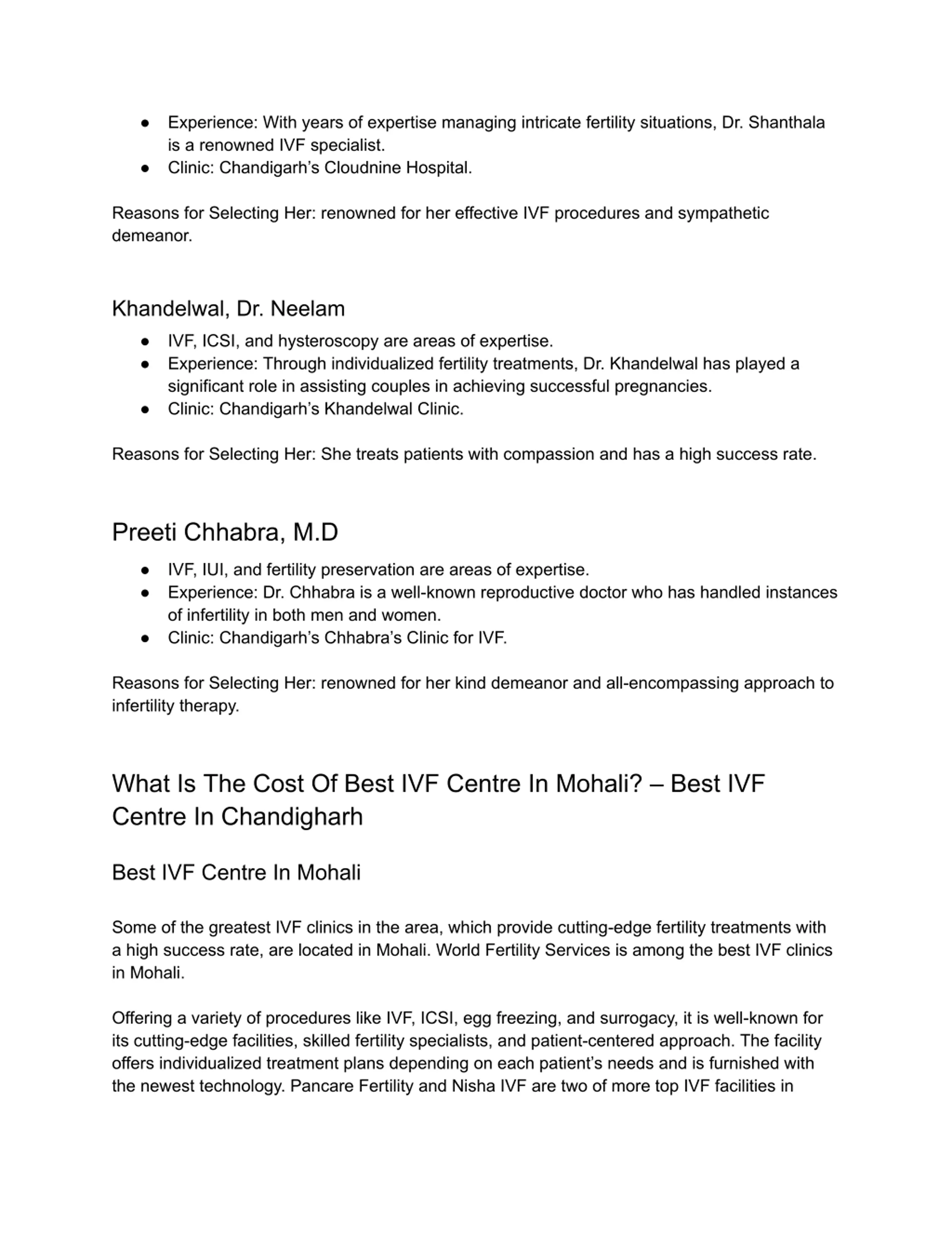 Experience: With years of expertise managing intricate fertility situations, Dr. Shanthala is a renowned IVF specialist. Clinic: Chandigarh s Cloudnine Hospital. Reasons for Selecting Her: renowned for her effective IVF procedures and sympathetic demeanor. Khandelwal, Dr. Neelam IVF, ICSI, and hysteroscopy are areas of expertise. Experience: Through individualized fertility treatments, Dr. Khandelwal has played a significant role in assisting couples in achieving successful pregnancies. Clinic: Chandigarh s Khandelwal Clinic. Reasons for Selecting Her: She treats patients with compassion and has a high success rate. Preeti Chhabra, M.D IVF, IUI, and fertility preservation are areas of expertise. Experience: Dr. Chhabra is a well-known reproductive doctor who has handled instances of infertility in both men and women. Clinic: Chandigarh s Chhabra s Clinic for IVF. Reasons for Selecting Her: renowned for her kind demeanor and all-encompassing approach to infertility therapy. What Is The Cost Of Best IVF Centre In Mohali? Best IVF Centre In Chandigharh Best IVF Centre In Mohali Some of the greatest IVF clinics in the area, which provide cutting-edge fertility treatments with a high success rate, are located in Mohali. World Fertility Services is among the best IVF clinics in Mohali. Offering a variety of procedures like IVF, ICSI, egg freezing, and surrogacy, it is well-known for its cutting-edge facilities, skilled fertility specialists, and patient-centered approach. The facility offers individualized treatment plans depending on each patient s needs and is furnished with the newest technology. Pancare Fertility and Nisha IVF are two of more top IVF facilities in