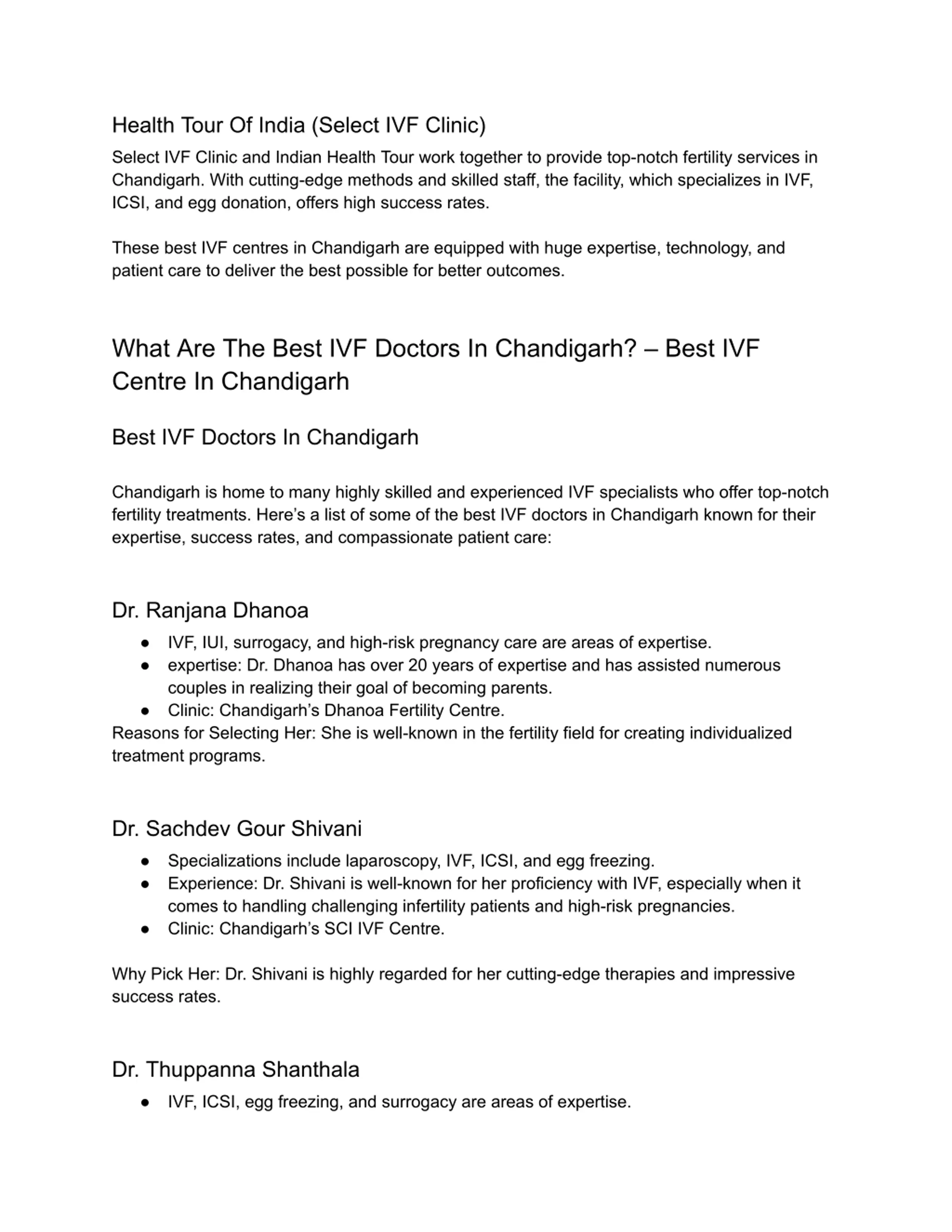 Health Tour Of India (Select IVF Clinic) Select IVF Clinic and Indian Health Tour work together to provide top-notch fertility services in Chandigarh. With cutting-edge methods and skilled staff, the facility, which specializes in IVF, ICSI, and egg donation, offers high success rates. These best IVF centres in Chandigarh are equipped with huge expertise, technology, and patient care to deliver the best possible for better outcomes. What Are The Best IVF Doctors In Chandigarh? Best IVF Centre In Chandigarh Best IVF Doctors In Chandigarh Chandigarh is home to many highly skilled and experienced IVF specialists who offer top-notch fertility treatments. Here s a list of some of the best IVF doctors in Chandigarh known for their expertise, success rates, and compassionate patient care: Dr. Ranjana Dhanoa IVF, IUI, surrogacy, and high-risk pregnancy care are areas of expertise. expertise: Dr. Dhanoa has over 20 years of expertise and has assisted numerous couples in realizing their goal of becoming parents. Clinic: Chandigarh s Dhanoa Fertility Centre. Reasons for Selecting Her: She is well-known in the fertility field for creating individualized treatment programs. Dr. Sachdev Gour Shivani Specializations include laparoscopy, IVF, ICSI, and egg freezing. Experience: Dr. Shivani is well-known for her proficiency with IVF, especially when it comes to handling challenging infertility patients and high-risk pregnancies. Clinic: Chandigarh s SCI IVF Centre. Why Pick Her: Dr. Shivani is highly regarded for her cutting-edge therapies and impressive success rates. Dr. Thuppanna Shanthala IVF, ICSI, egg freezing, and surrogacy are areas of expertise.
