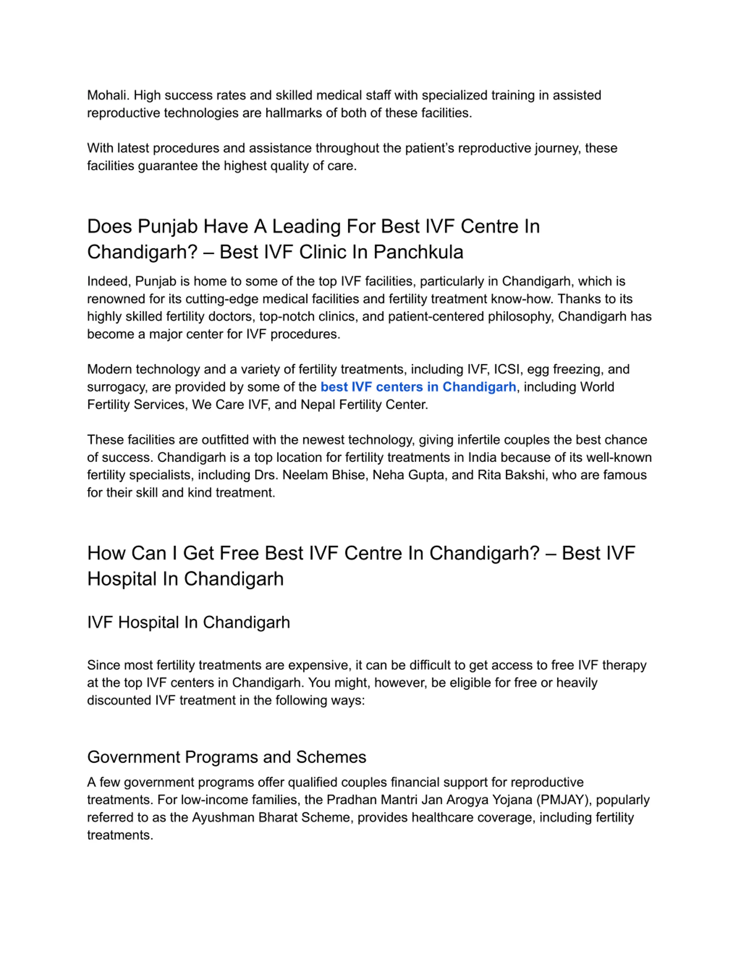 Mohali. High success rates and skilled medical staff with specialized training in assisted reproductive technologies are hallmarks of both of these facilities. With latest procedures and assistance throughout the patient s reproductive journey, these facilities guarantee the highest quality of care. Does Punjab Have A Leading For Best IVF Centre In Chandigarh? Best IVF Clinic In Panchkula Indeed, Punjab is home to some of the top IVF facilities, particularly in Chandigarh, which is renowned for its cutting-edge medical facilities and fertility treatment know-how. Thanks to its highly skilled fertility doctors, top-notch clinics, and patient-centered philosophy, Chandigarh has become a major center for IVF procedures. Modern technology and a variety of fertility treatments, including IVF, ICSI, egg freezing, and surrogacy, are provided by some of the best IVF centers in Chandigarh, including World Fertility Services, We Care IVF, and Nepal Fertility Center. These facilities are outfitted with the newest technology, giving infertile couples the best chance of success. Chandigarh is a top location for fertility treatments in India because of its well-known fertility specialists, including Drs. Neelam Bhise, Neha Gupta, and Rita Bakshi, who are famous for their skill and kind treatment. How Can I Get Free Best IVF Centre In Chandigarh? Best IVF Hospital In Chandigarh IVF Hospital In Chandigarh Since most fertility treatments are expensive, it can be difficult to get access to free IVF therapy at the top IVF centers in Chandigarh. You might, however, be eligible for free or heavily discounted IVF treatment in the following ways: Government Programs and Schemes A few government programs offer qualified couples financial support for reproductive treatments. For low-income families, the Pradhan Mantri Jan Arogya Yojana (PMJAY), popularly referred to as the Ayushman Bharat Scheme, provides healthcare coverage, including fertility treatments.