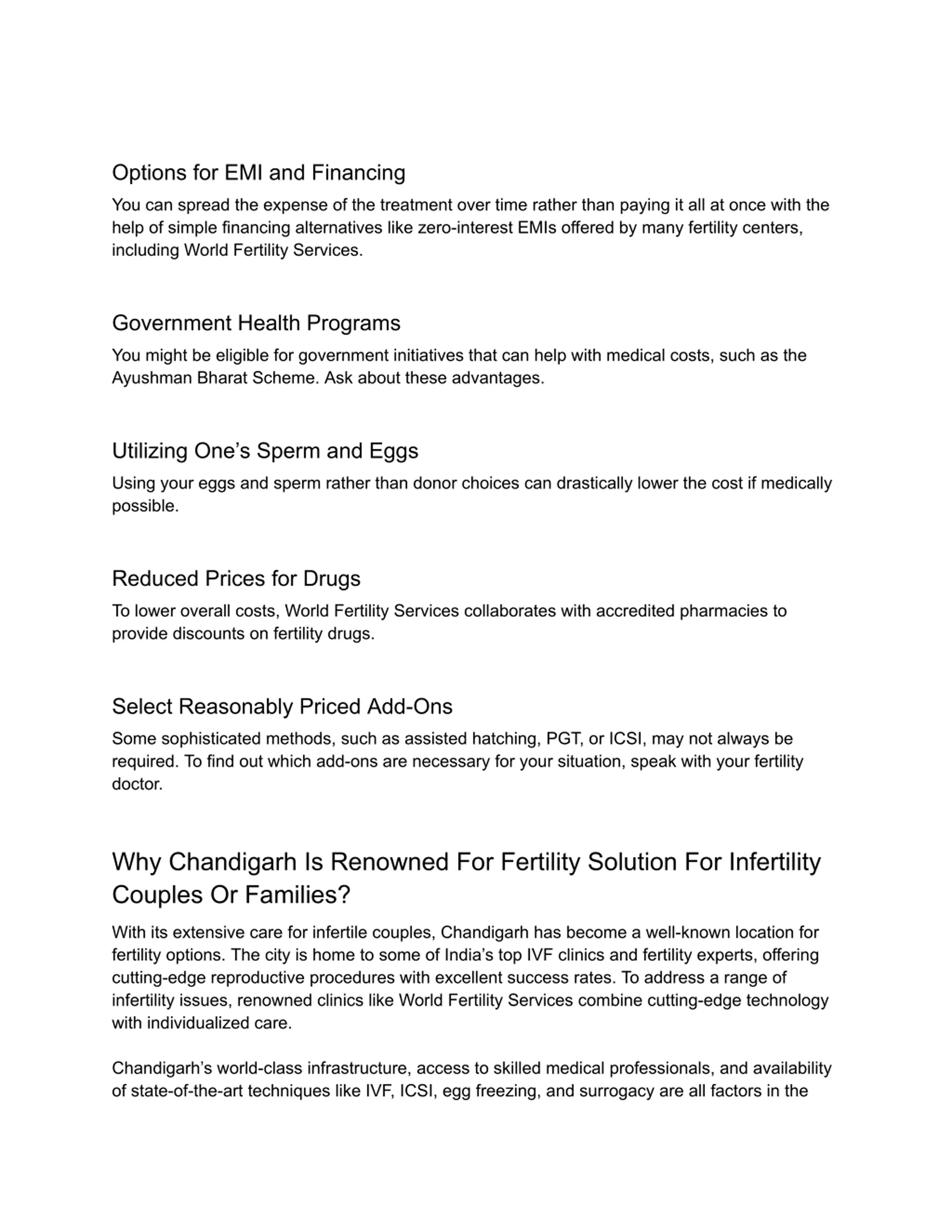 Options for EMI and Financing You can spread the expense of the treatment over time rather than paying it all at once with the help of simple financing alternatives like zero-interest EMIs offered by many fertility centers, including World Fertility Services. Government Health Programs You might be eligible for government initiatives that can help with medical costs, such as the Ayushman Bharat Scheme. Ask about these advantages. Utilizing One s Sperm and Eggs Using your eggs and sperm rather than donor choices can drastically lower the cost if medically possible. Reduced Prices for Drugs To lower overall costs, World Fertility Services collaborates with accredited pharmacies to provide discounts on fertility drugs. Select Reasonably Priced Add-Ons Some sophisticated methods, such as assisted hatching, PGT, or ICSI, may not always be required. To find out which add-ons are necessary for your situation, speak with your fertility doctor. Why Chandigarh Is Renowned For Fertility Solution For Infertility Couples Or Families? With its extensive care for infertile couples, Chandigarh has become a well-known location for fertility options. The city is home to some of India s top IVF clinics and fertility experts, offering cutting-edge reproductive procedures with excellent success rates. To address a range of infertility issues, renowned clinics like World Fertility Services combine cutting-edge technology with individualized care. Chandigarh s world-class infrastructure, access to skilled medical professionals, and availability of state-of-the-art techniques like IVF, ICSI, egg freezing, and surrogacy are all factors in the