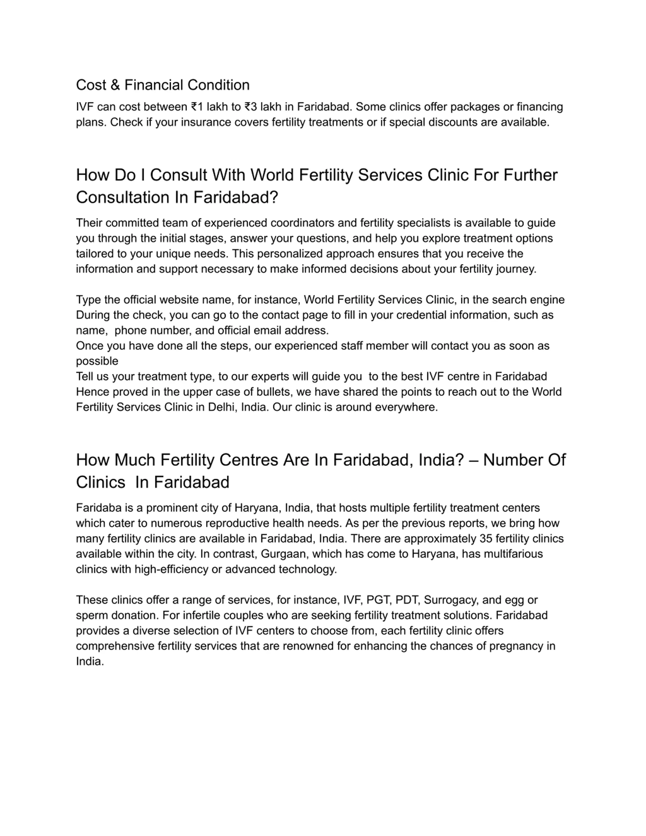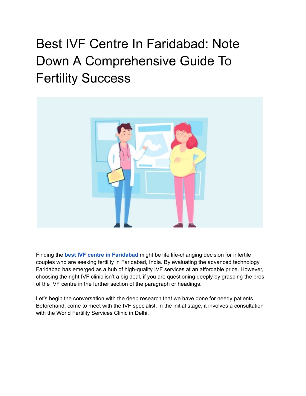 Best IVF Centre In Faridabad: Note Down A Comprehensive Guide To Fertility Success Finding the best IVF centre in Faridabad might be life life-changing decision for infertile couples who are seeking fertility in Faridabad, India. By evaluating the advanced technology, Faridabad has emerged as a hub of high-quality IVF services at an affordable price. However, choosing the right IVF clinic isn t a big deal, if you are questioning deeply by grasping the pros of the IVF centre in the further section of the paragraph or headings. Let s begin the conversation with the deep research that we have done for needy patients. Beforehand, come to meet with the IVF specialist, in the initial stage, it involves a consultation with the World Fertility Services Clinic in Delhi.