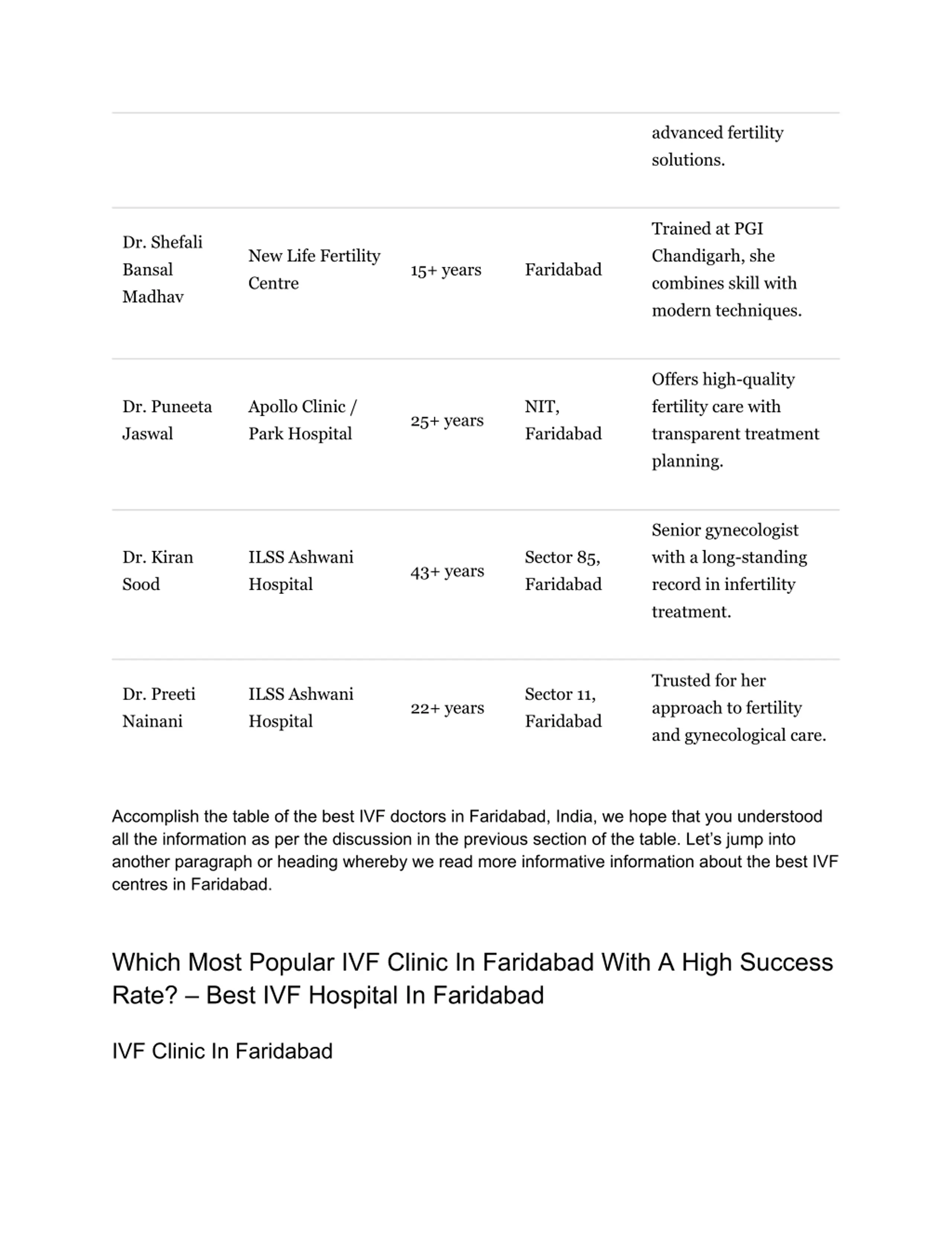 How Do I Get To Know The Best IVF Doctors In Faridabad, India? IVF Doctor List In Faridabad IVF Doctor List In Faridabad Finding the best IVF doctors in Faridabad can be difficult to recognize with the help of the table mentioned in the further section of the article. These doctors have 10 years of experience in the medical world for fertility treatment at an accessible costs. Underline some sentences that we have written, such as these doctors ensure to do treatment with advanced technology equipment or high-efficiency techniques that will help to conceive easily. Doctor Name Experienc e Clinic/Hospital Location Short Description Veteran IVF specialist known for personalized care and high success rates. Dr. Anjuli Dixit Anjuli Nursing Home Sector 84, Faridabad 34+ years New Industrial Township 1, Faridabad Highly experienced in infertility and reproductive endocrinology. Dr. Bhavna Banga Cloudnine Hospital 22+ years Renowned for ethical IVF practices and individualized fertility care. Dr. Aradhana Kalra Dawar Sector 15A, Faridabad Amayah IVF 21+ years Known for compassionate treatment and Dr. Astha Chakravarty Asha Fertility Clinic NIT 1, Faridabad 19+ years