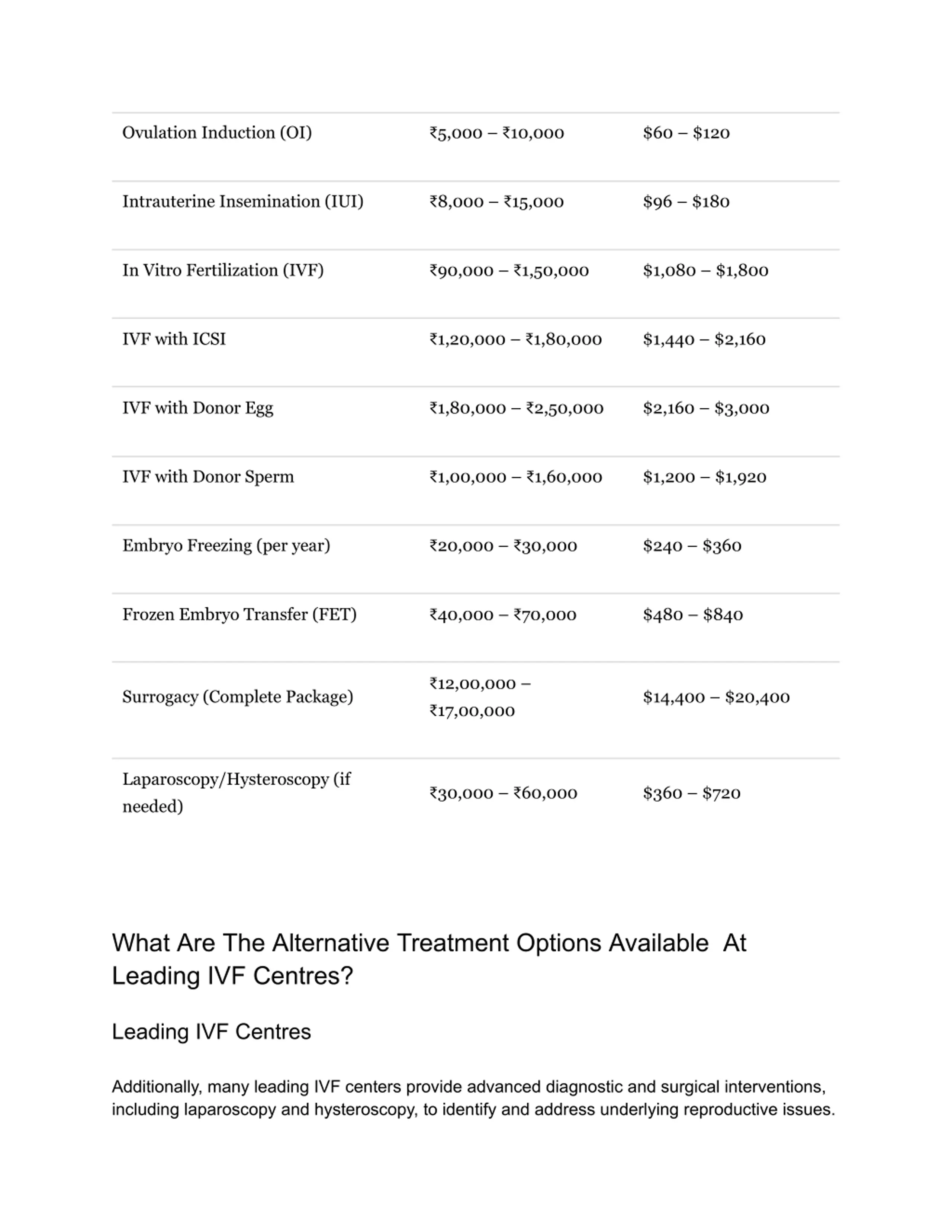 Ovulation Induction (OI) 5,000 10,000 $60 $120 Intrauterine Insemination (IUI) 8,000 15,000 $96 $180 In Vitro Fertilization (IVF) 90,000 1,50,000 $1,080 $1,800 IVF with ICSI 1,20,000 1,80,000 $1,440 $2,160 IVF with Donor Egg 1,80,000 2,50,000 $2,160 $3,000 IVF with Donor Sperm 1,00,000 1,60,000 $1,200 $1,920 Embryo Freezing (per year) 20,000 30,000 $240 $360 Frozen Embryo Transfer (FET) 40,000 70,000 $480 $840 12,00,000 17,00,000 Surrogacy (Complete Package) $14,400 $20,400 Laparoscopy/Hysteroscopy (if needed) 30,000 60,000 $360 $720 What Are The Alternative Treatment Options Available At Leading IVF Centres? Leading IVF Centres Additionally, many leading IVF centers provide advanced diagnostic and surgical interventions, including laparoscopy and hysteroscopy, to identify and address underlying reproductive issues.