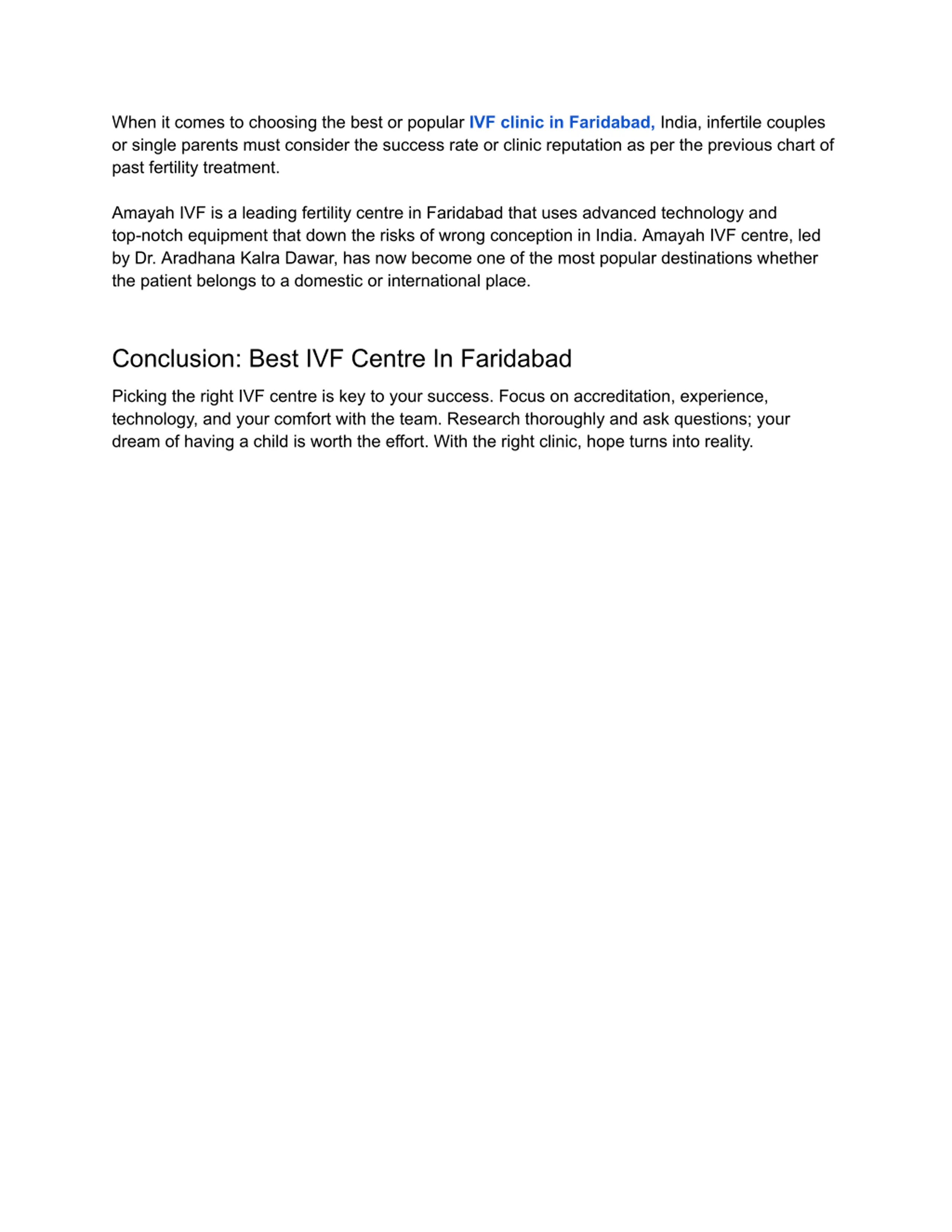 When it comes to choosing the best or popular IVF clinic in Faridabad, India, infertile couples or single parents must consider the success rate or clinic reputation as per the previous chart of past fertility treatment. Amayah IVF is a leading fertility centre in Faridabad that uses advanced technology and top-notch equipment that down the risks of wrong conception in India. Amayah IVF centre, led by Dr. Aradhana Kalra Dawar, has now become one of the most popular destinations whether the patient belongs to a domestic or international place. Conclusion: Best IVF Centre In Faridabad Picking the right IVF centre is key to your success. Focus on accreditation, experience, technology, and your comfort with the team. Research thoroughly and ask questions; your dream of having a child is worth the effort. With the right clinic, hope turns into reality.