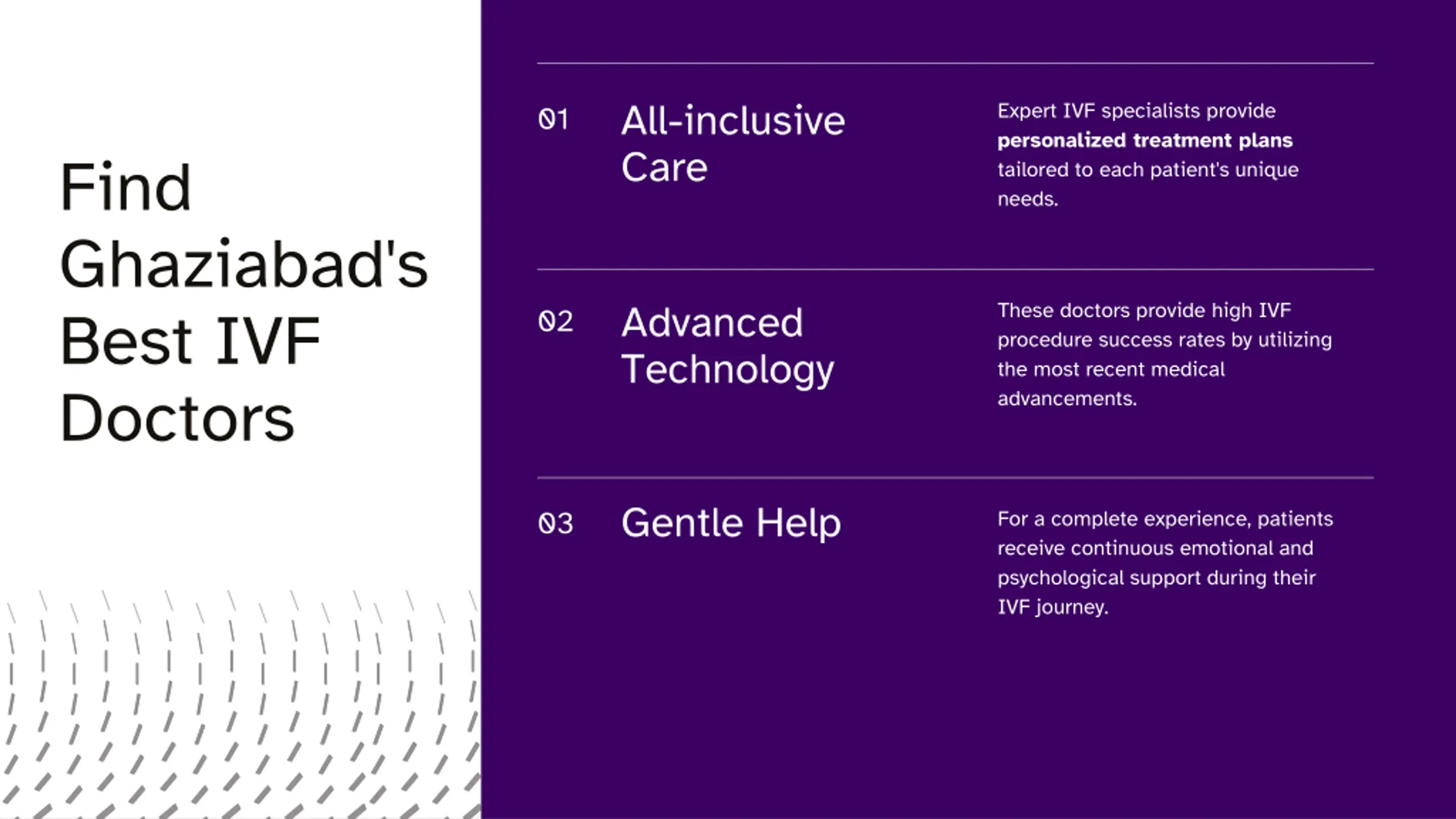 All-inclusive Care Expert IVF specialists provide personalized treatment plans tailored to each patient's unique needs. 01 Find Ghaziabad's Best IVF Doctors Advanced Technology These doctors provide high IVF procedure success rates by utilizing the most recent medical advancements. 02 Gentle Help 03 For a complete experience, patients receive continuous emotional and psychological support during their IVF journey.