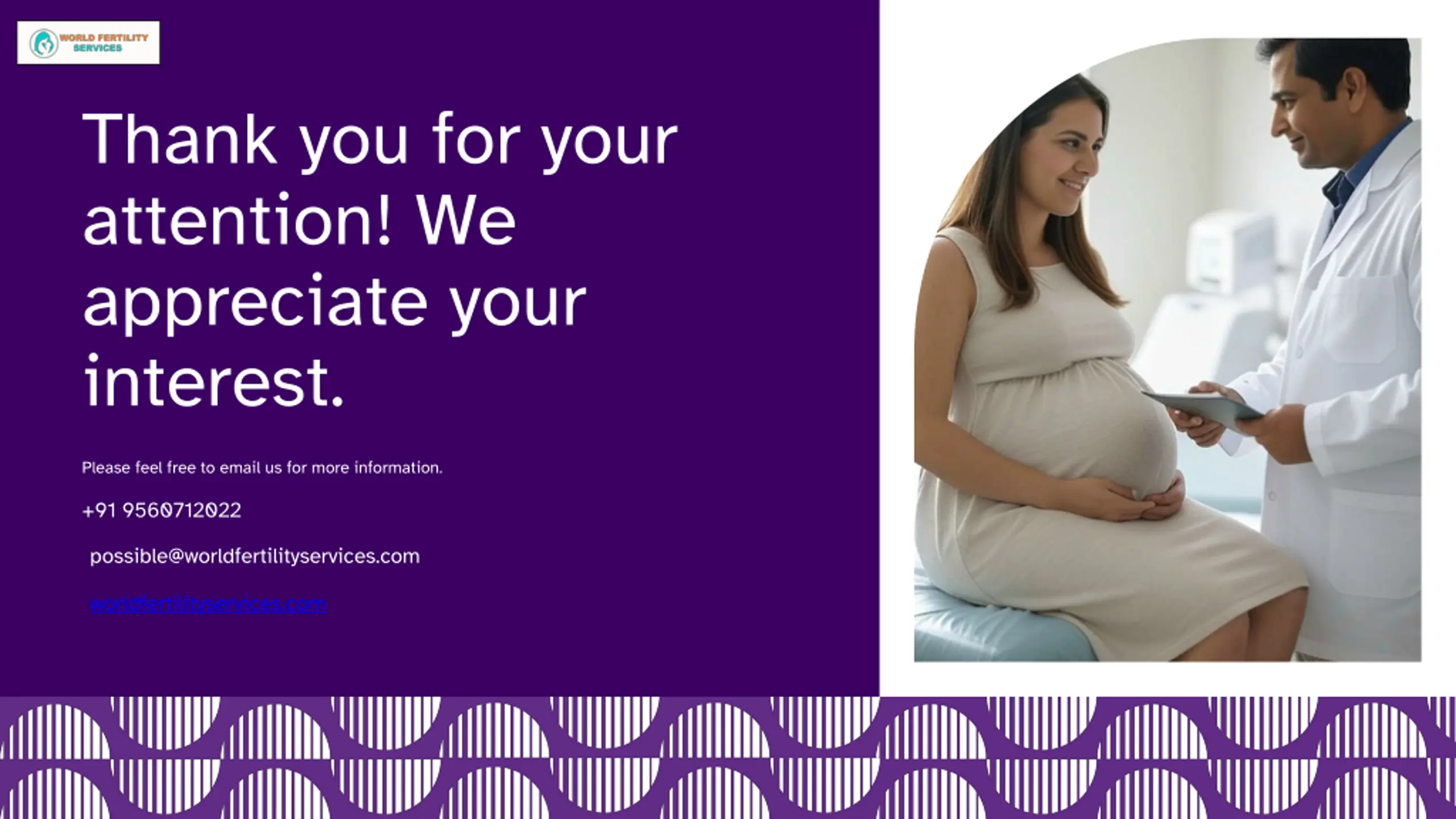 Thank you for your attention! We appreciate your interest. Please feel free to email us for more information. +91 9560712022 possible@worldfertilityservices.com worldfertilityservices.com