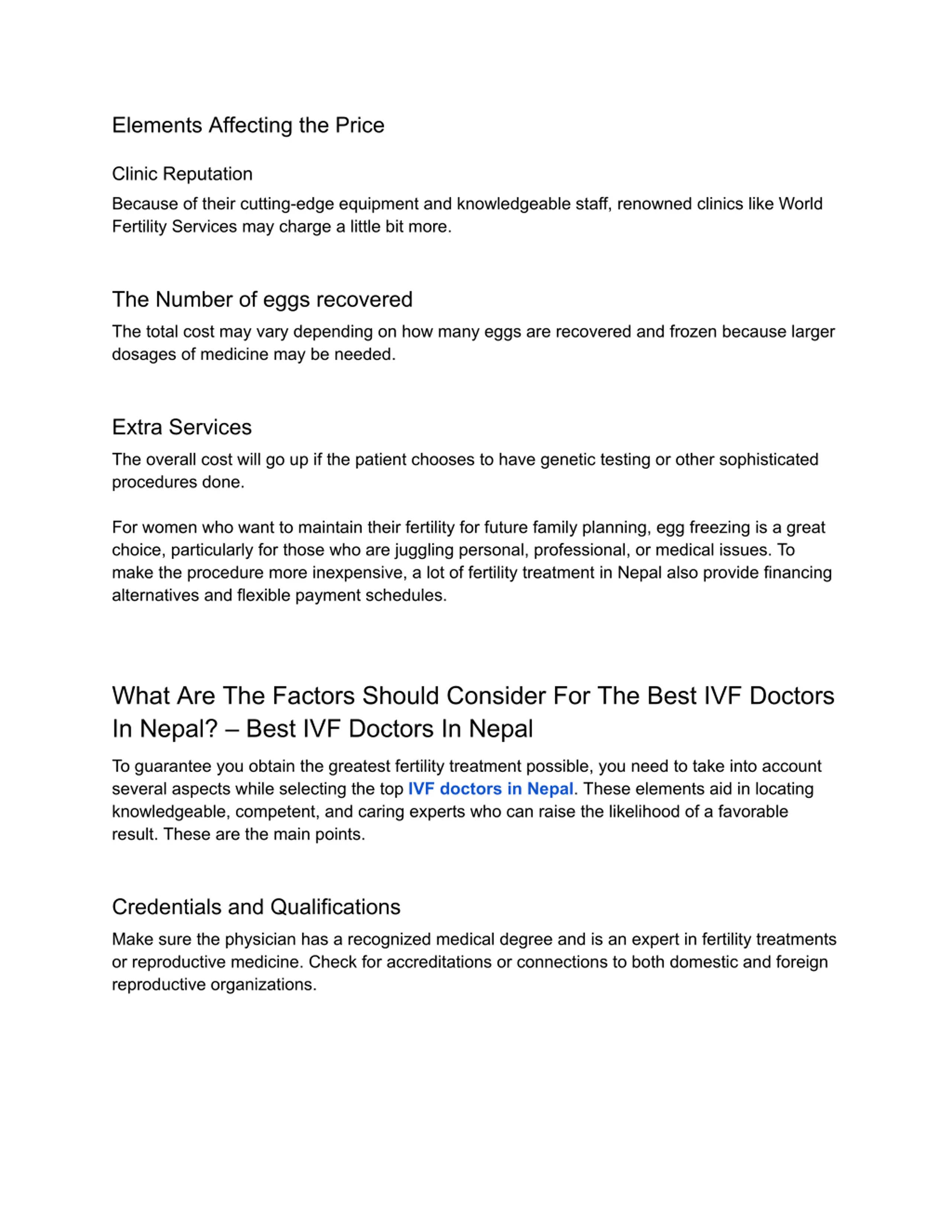 Elements Affecting the Price Clinic Reputation Because of their cutting-edge equipment and knowledgeable staff, renowned clinics like World Fertility Services may charge a little bit more. The Number of eggs recovered The total cost may vary depending on how many eggs are recovered and frozen because larger dosages of medicine may be needed. Extra Services The overall cost will go up if the patient chooses to have genetic testing or other sophisticated procedures done. For women who want to maintain their fertility for future family planning, egg freezing is a great choice, particularly for those who are juggling personal, professional, or medical issues. To make the procedure more inexpensive, a lot of fertility treatment in Nepal also provide financing alternatives and flexible payment schedules. What Are The Factors Should Consider For The Best IVF Doctors In Nepal? Best IVF Doctors In Nepal To guarantee you obtain the greatest fertility treatment possible, you need to take into account several aspects while selecting the top IVF doctors in Nepal. These elements aid in locating knowledgeable, competent, and caring experts who can raise the likelihood of a favorable result. These are the main points. Credentials and Qualifications Make sure the physician has a recognized medical degree and is an expert in fertility treatments or reproductive medicine. Check for accreditations or connections to both domestic and foreign reproductive organizations.