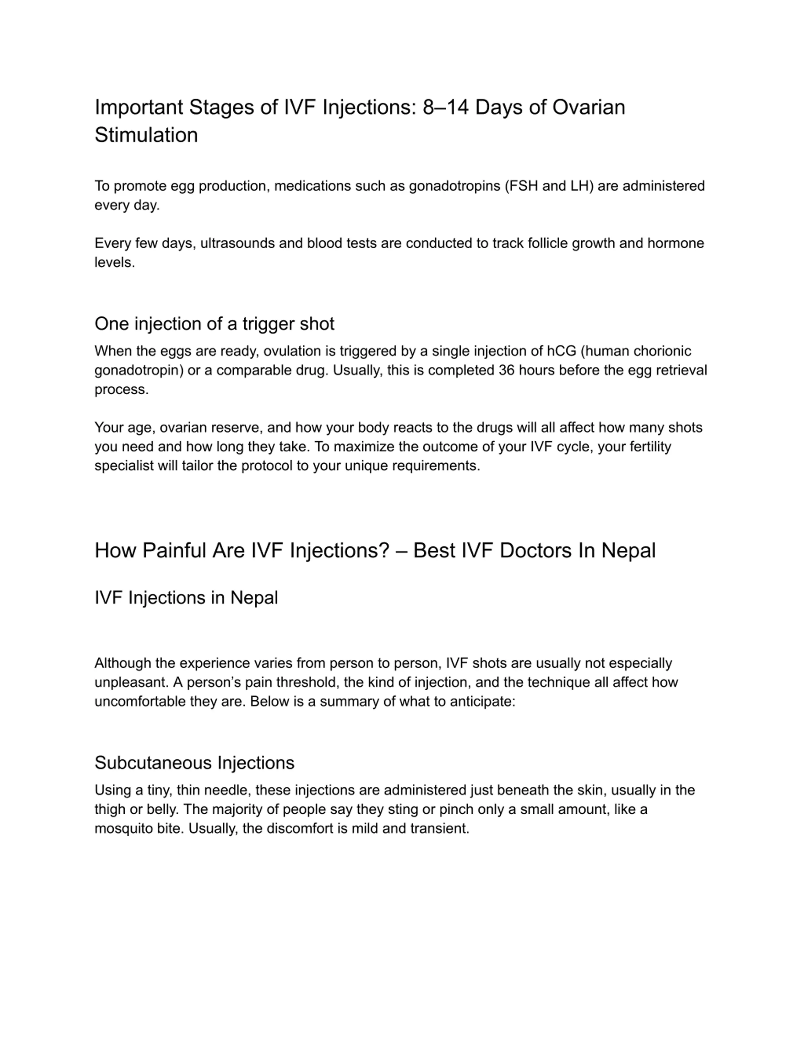 Important Stages of IVF Injections: 814 Days of Ovarian Stimulation To promote egg production, medications such as gonadotropins (FSH and LH) are administered every day. Every few days, ultrasounds and blood tests are conducted to track follicle growth and hormone levels. One injection of a trigger shot When the eggs are ready, ovulation is triggered by a single injection of hCG (human chorionic gonadotropin) or a comparable drug. Usually, this is completed 36 hours before the egg retrieval process. Your age, ovarian reserve, and how your body reacts to the drugs will all affect how many shots you need and how long they take. To maximize the outcome of your IVF cycle, your fertility specialist will tailor the protocol to your unique requirements. How Painful Are IVF Injections? Best IVF Doctors In Nepal IVF Injections in Nepal Although the experience varies from person to person, IVF shots are usually not especially unpleasant. A person s pain threshold, the kind of injection, and the technique all affect how uncomfortable they are. Below is a summary of what to anticipate: Subcutaneous Injections Using a tiny, thin needle, these injections are administered just beneath the skin, usually in the thigh or belly. The majority of people say they sting or pinch only a small amount, like a mosquito bite. Usually, the discomfort is mild and transient.
