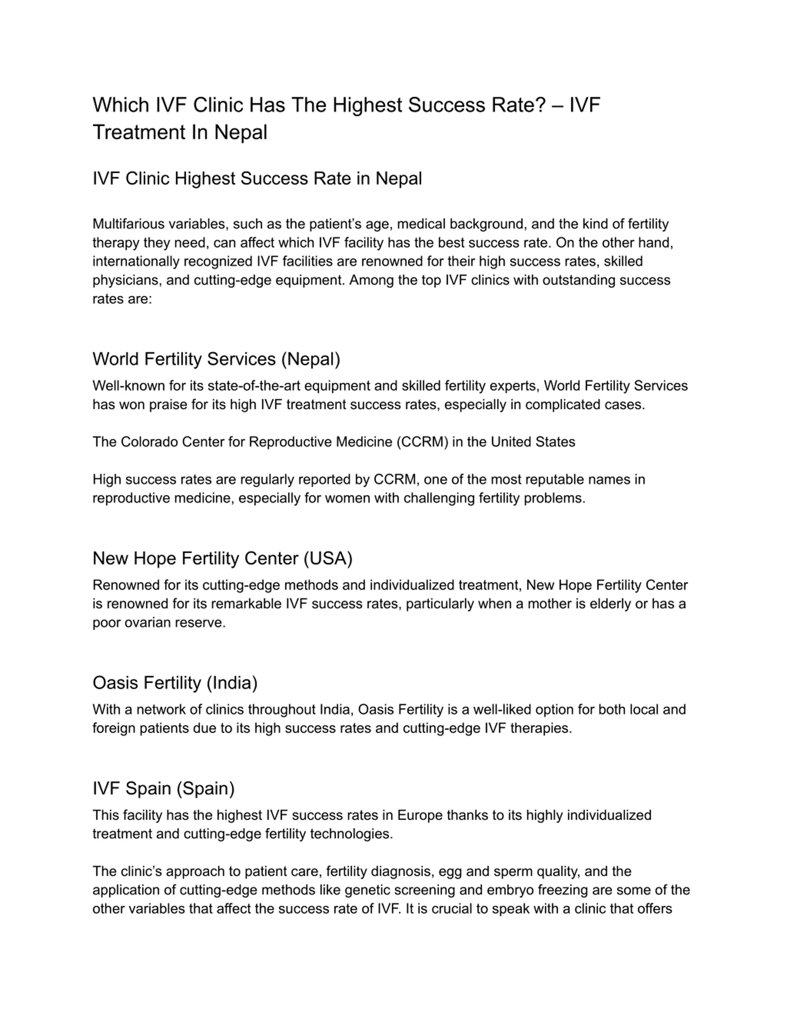 Which IVF Clinic Has The Highest Success Rate? IVF Treatment In Nepal IVF Clinic Highest Success Rate in Nepal Multifarious variables, such as the patient s age, medical background, and the kind of fertility therapy they need, can affect which IVF facility has the best success rate. On the other hand, internationally recognized IVF facilities are renowned for their high success rates, skilled physicians, and cutting-edge equipment. Among the top IVF clinics with outstanding success rates are: World Fertility Services (Nepal) Well-known for its state-of-the-art equipment and skilled fertility experts, World Fertility Services has won praise for its high IVF treatment success rates, especially in complicated cases. The Colorado Center for Reproductive Medicine (CCRM) in the United States High success rates are regularly reported by CCRM, one of the most reputable names in reproductive medicine, especially for women with challenging fertility problems. New Hope Fertility Center (USA) Renowned for its cutting-edge methods and individualized treatment, New Hope Fertility Center is renowned for its remarkable IVF success rates, particularly when a mother is elderly or has a poor ovarian reserve. Oasis Fertility (India) With a network of clinics throughout India, Oasis Fertility is a well-liked option for both local and foreign patients due to its high success rates and cutting-edge IVF therapies. IVF Spain (Spain) This facility has the highest IVF success rates in Europe thanks to its highly individualized treatment and cutting-edge fertility technologies. The clinic s approach to patient care, fertility diagnosis, egg and sperm quality, and the application of cutting-edge methods like genetic screening and embryo freezing are some of the other variables that affect the success rate of IVF. It is crucial to speak with a clinic that offers