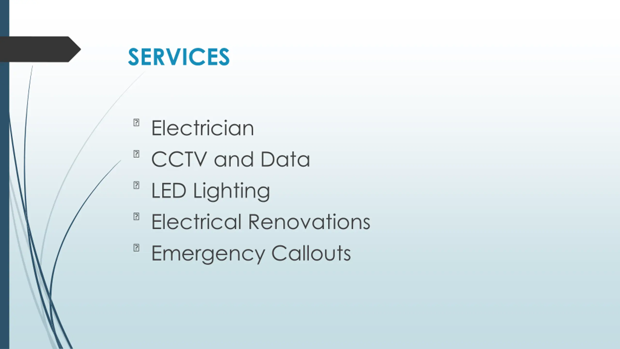 SERVICES ?Electrician ?CCTV and Data ?LED Lighting ?Electrical Renovations ?Emergency Callouts