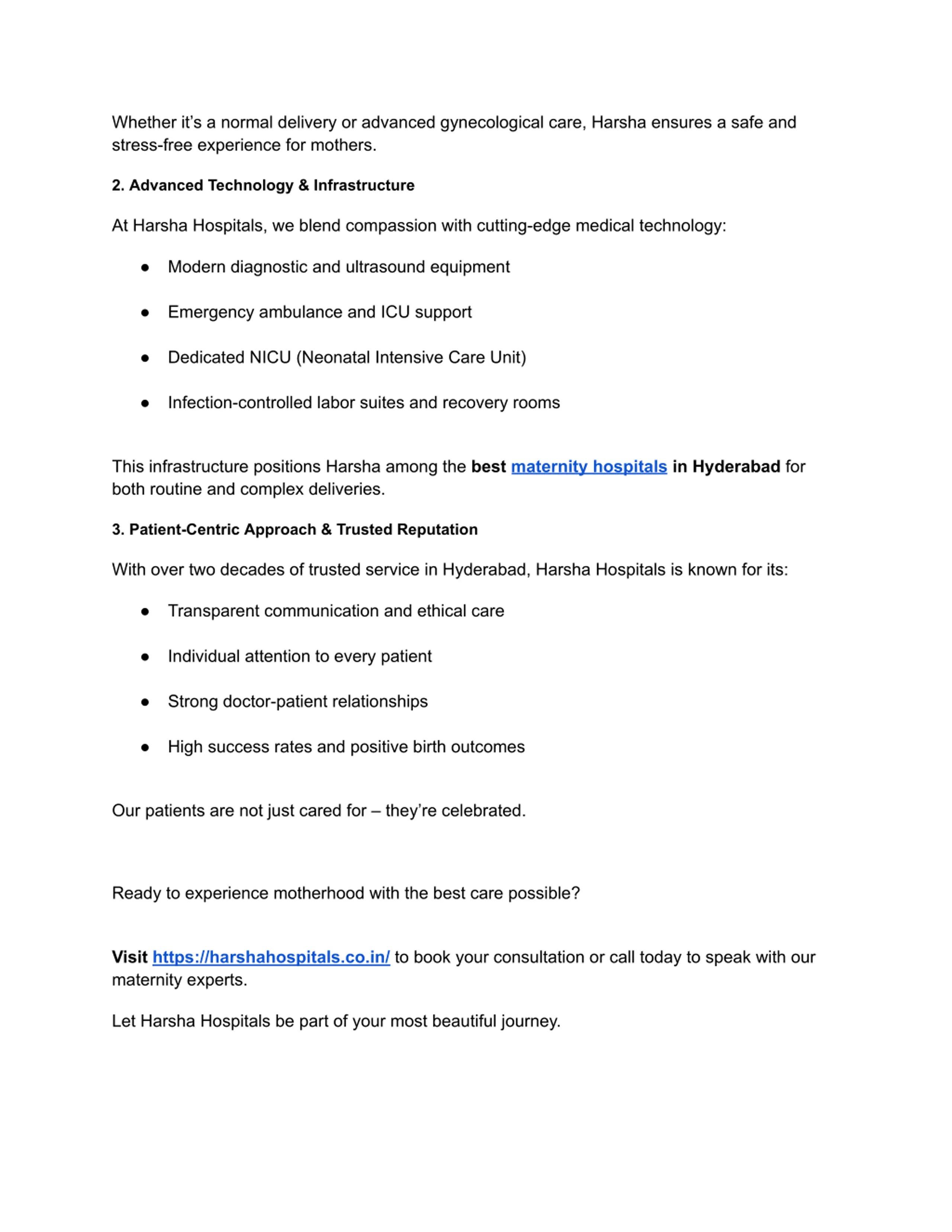 Whether its a normal delivery or advanced gynecological care, Harsha ensures a safe and stress-free experience for mothers. 2. Advanced Technology & Infrastructure At Harsha Hospitals, we blend compassion with cutting-edge medical technology: Modern diagnostic and ultrasound equipment Emergency ambulance and ICU support Dedicated NICU (Neonatal Intensive Care Unit) Infection-controlled labor suites and recovery rooms This infrastructure positions Harsha among the best maternity hospitals in Hyderabad for both routine and complex deliveries. 3. Patient-Centric Approach & Trusted Reputation With over two decades of trusted service in Hyderabad, Harsha Hospitals is known for its: Transparent communication and ethical care Individual attention to every patient Strong doctor-patient relationships High success rates and positive birth outcomes Our patients are not just cared for they re celebrated. Ready to experience motherhood with the best care possible? Visit https://harshahospitals.co.in/ to book your consultation or call today to speak with our maternity experts. Let Harsha Hospitals be part of your most beautiful journey.