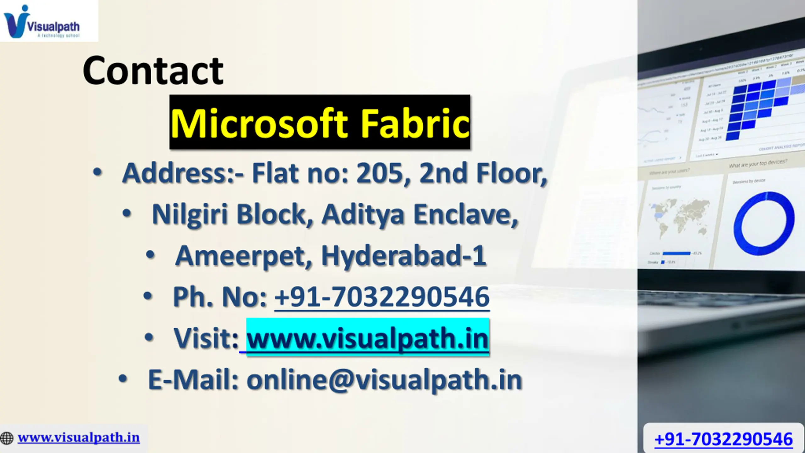 Contact Microsoft Fabric Address:- Flat no: 205, 2nd Floor, Nilgiri Block, Aditya Enclave, Ameerpet, Hyderabad-1 Ph. No: +91-7032290546 Visit: www.visualpath.in E-Mail: online@visualpath.in +91-7032290546