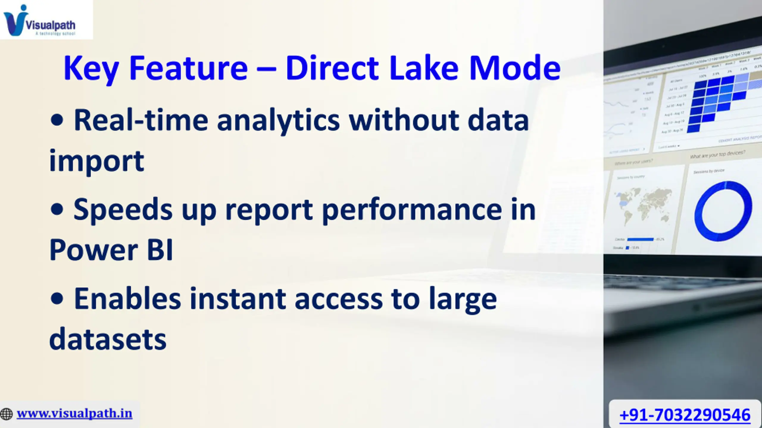 Key Feature Direct Lake Mode Real-time analytics without data import Speeds up report performance in Power BI Enables instant access to large datasets +91-7032290546