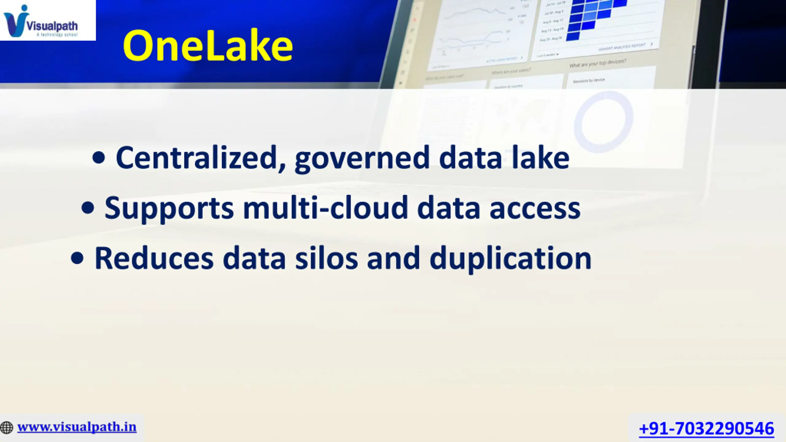 OneLake Centralized, governed data lake Supports multi-cloud data access Reduces data silos and duplication +91-7032290546