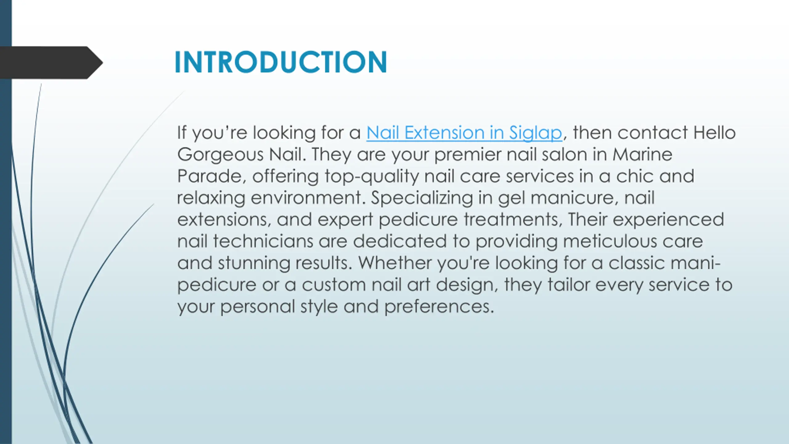 INTRODUCTION If you re looking for a Nail Extension in Siglap, then contact Hello Gorgeous Nail. They are your premier nail salon in Marine Parade, offering top-quality nail care services in a chic and relaxing environment. Specializing in gel manicure, nail extensions, and expert pedicure treatments, Their experienced nail technicians are dedicated to providing meticulous care and stunning results. Whether you're looking for a classic mani- pedicure or a custom nail art design, they tailor every service to your personal style and preferences.