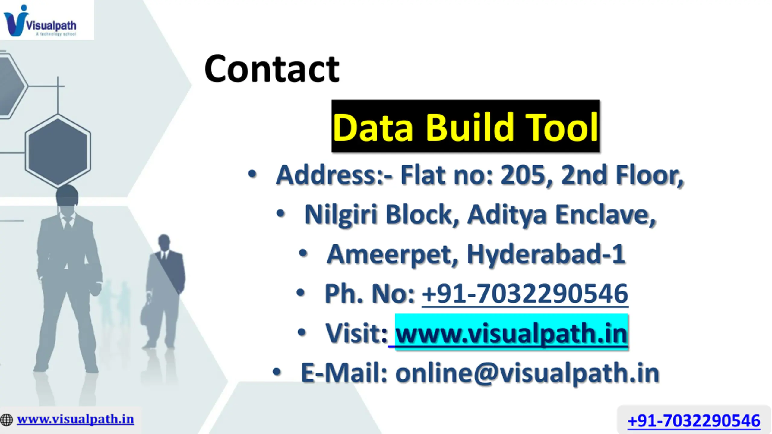 Contact Data Build Tool Address:- Flat no: 205, 2nd Floor, Nilgiri Block, Aditya Enclave, Ameerpet, Hyderabad-1 Ph. No: +91-7032290546 Visit: www.visualpath.in E-Mail: online@visualpath.in +91-7032290546