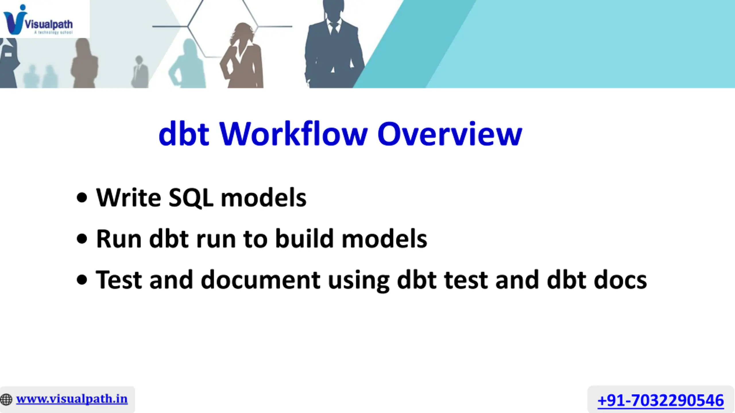 dbt Workflow Overview Write SQL models Run dbt run to build models Test and document using dbt test and dbt docs +91-7032290546