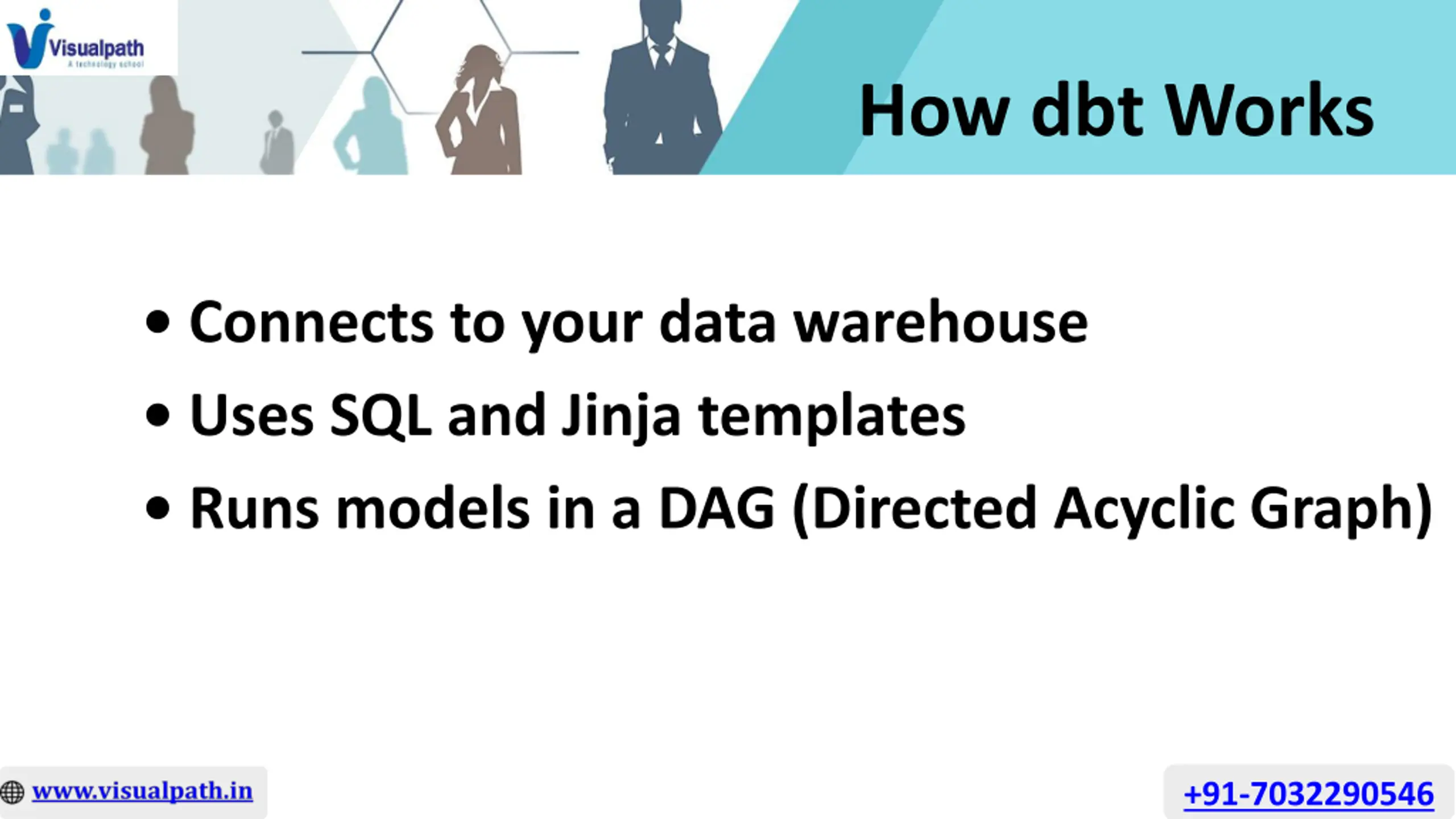 How dbt Works Connects to your data warehouse Uses SQL and Jinja templates Runs models in a DAG (Directed Acyclic Graph) +91-7032290546