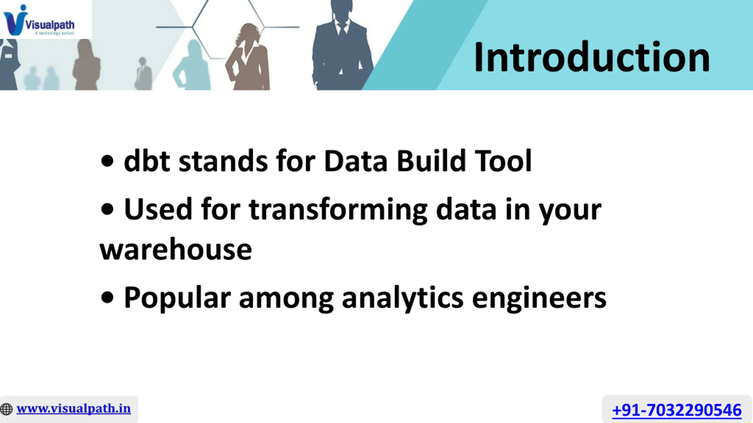 Introduction dbt stands for Data Build Tool Used for transforming data in your warehouse Popular among analytics engineers +91-7032290546