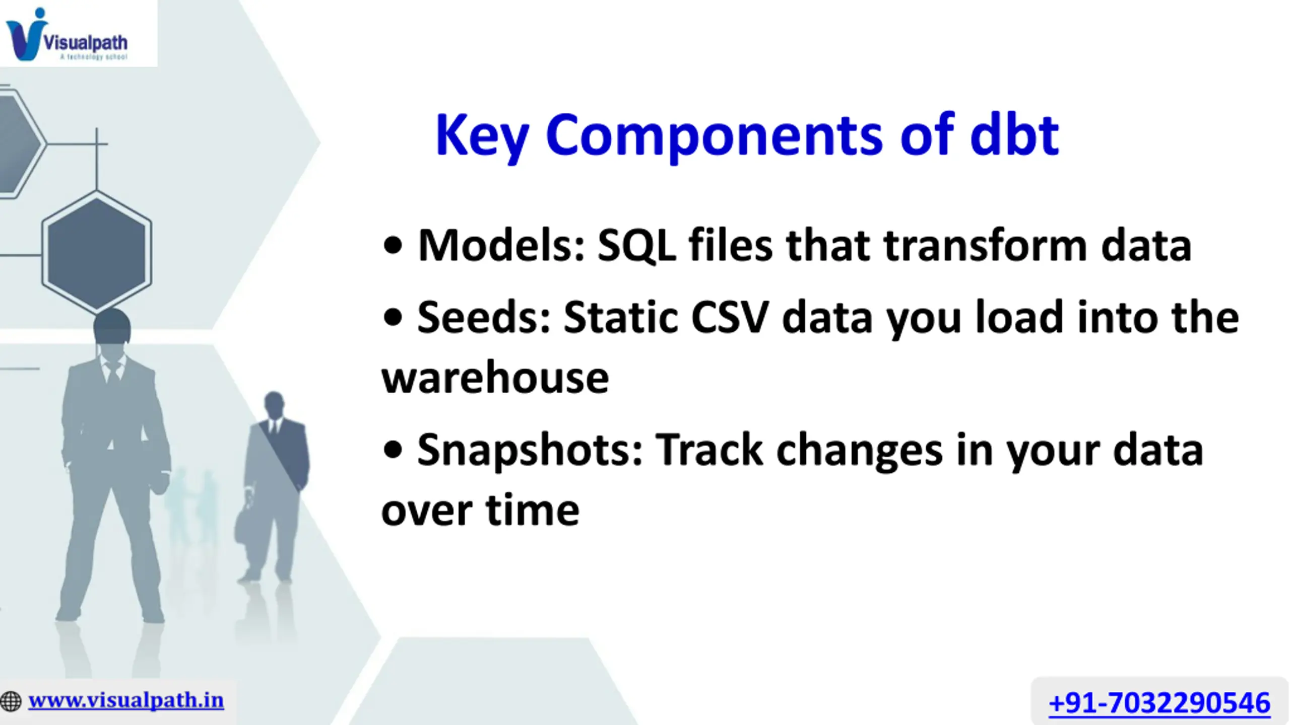 Key Components of dbt Models: SQL files that transform data Seeds: Static CSV data you load into the warehouse Snapshots: Track changes in your data over time +91-7032290546