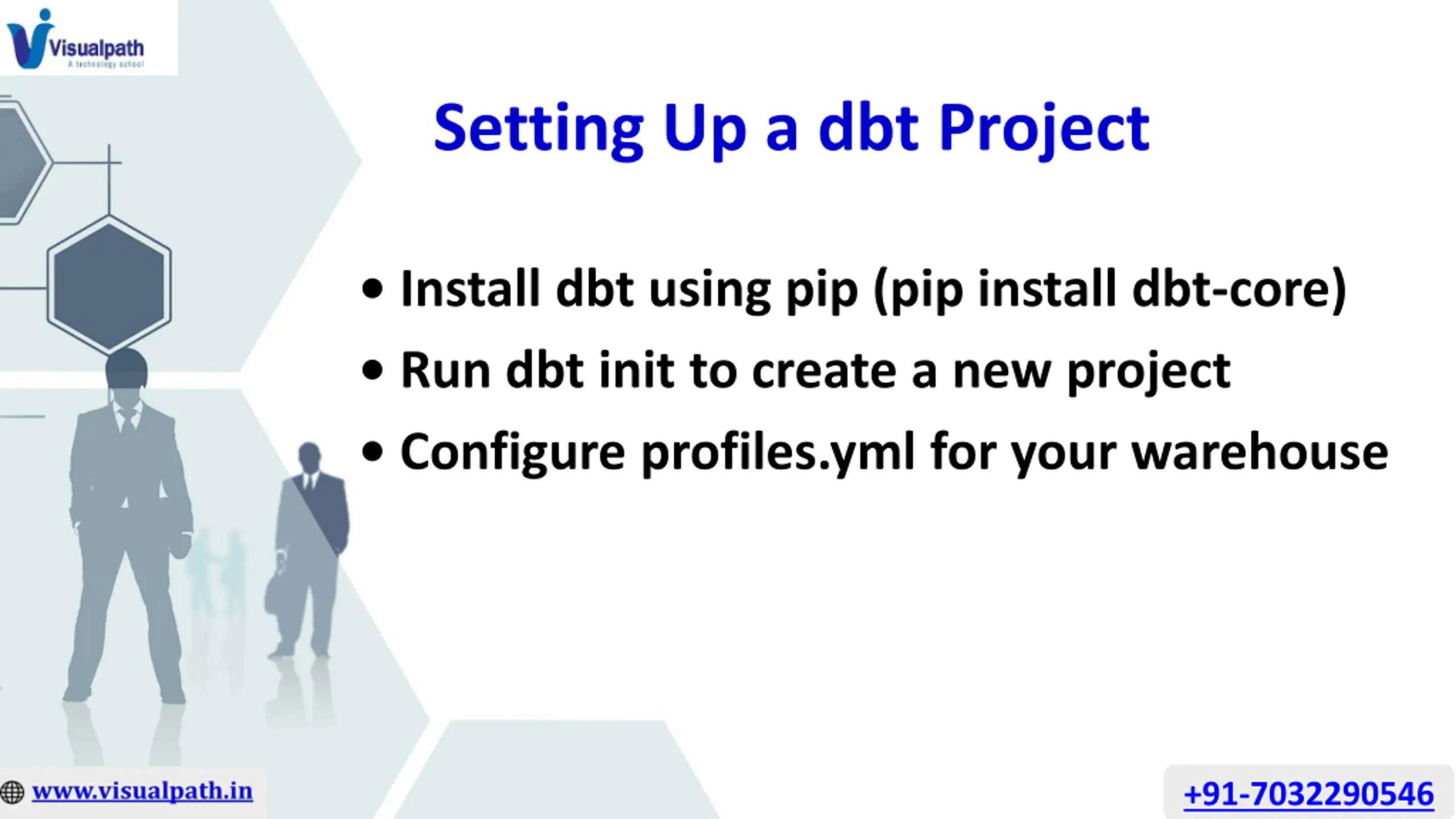 Setting Up a dbt Project Install dbt using pip (pip install dbt-core) Run dbt init to create a new project Configure profiles.yml for your warehouse +91-7032290546